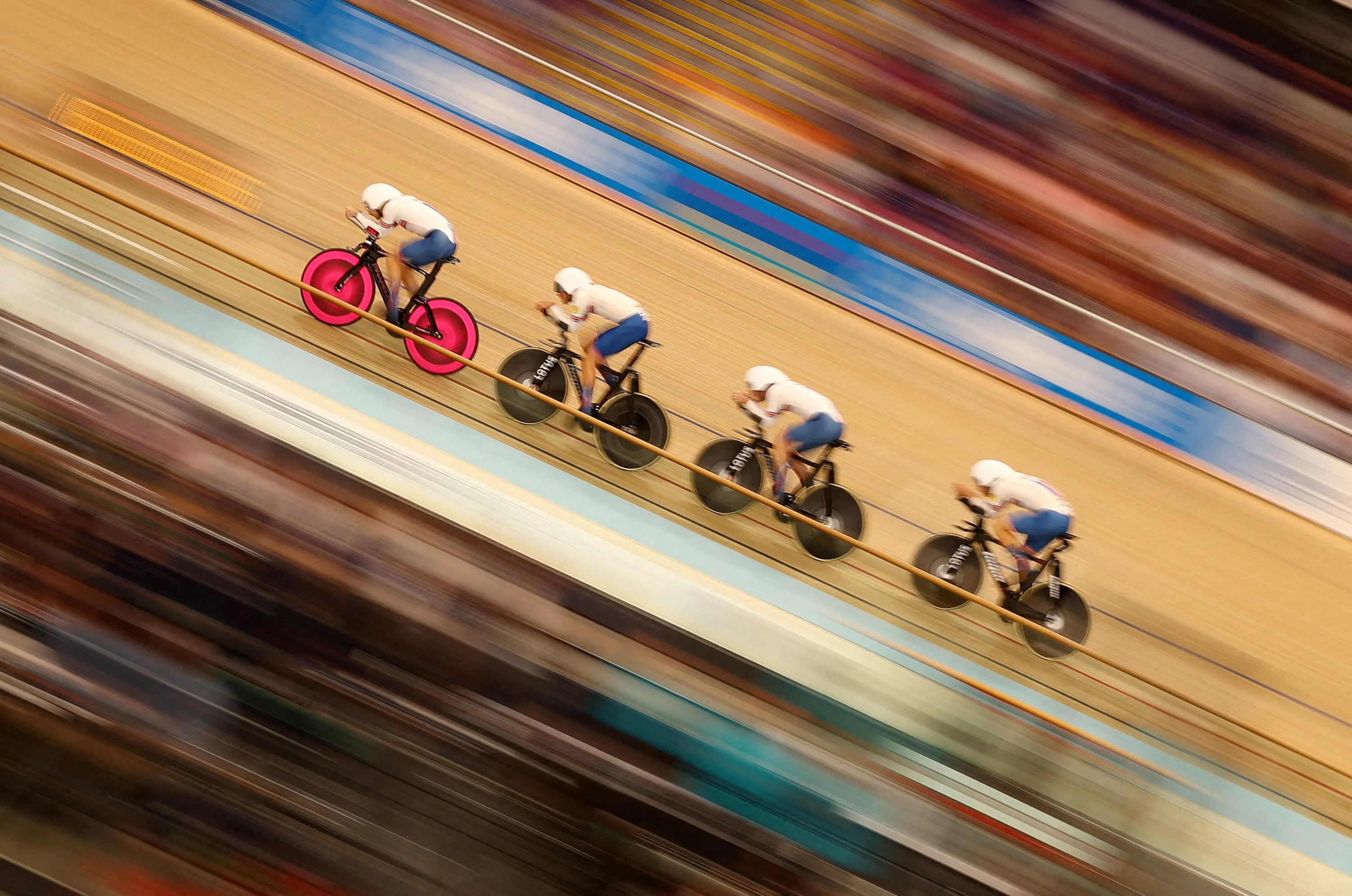 Britain's Daniel Bigham, Charlie Tanfield, Oliver Wood and Ethan Vernon in action during the men's elite team pursuit qualification at the UCI World Championships in Glasgow, Scotland on August 3, 2023. (Photo by Matthew Childs/Reuters)