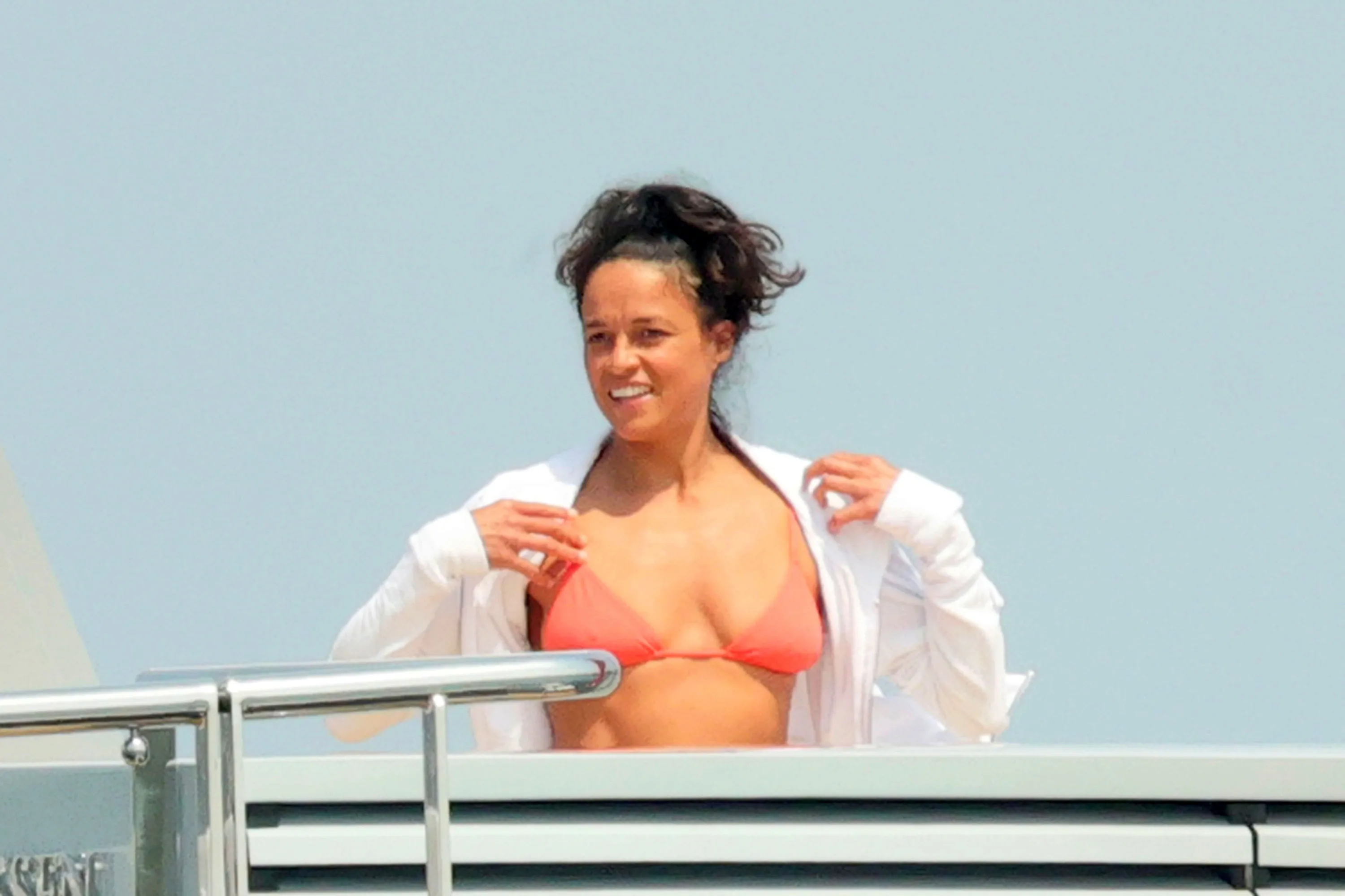 Michelle Rodriguez shows off her bikini body as she soaks in the sun during her vacation in the last decade of July 2023. The Fast And Furious actress was spotted playing with a basketball and relaxing on a yacht in Porto Cervo, Sardinia. (Photo by Ciao Pix/Shutterstock/Splash News and Pictures)