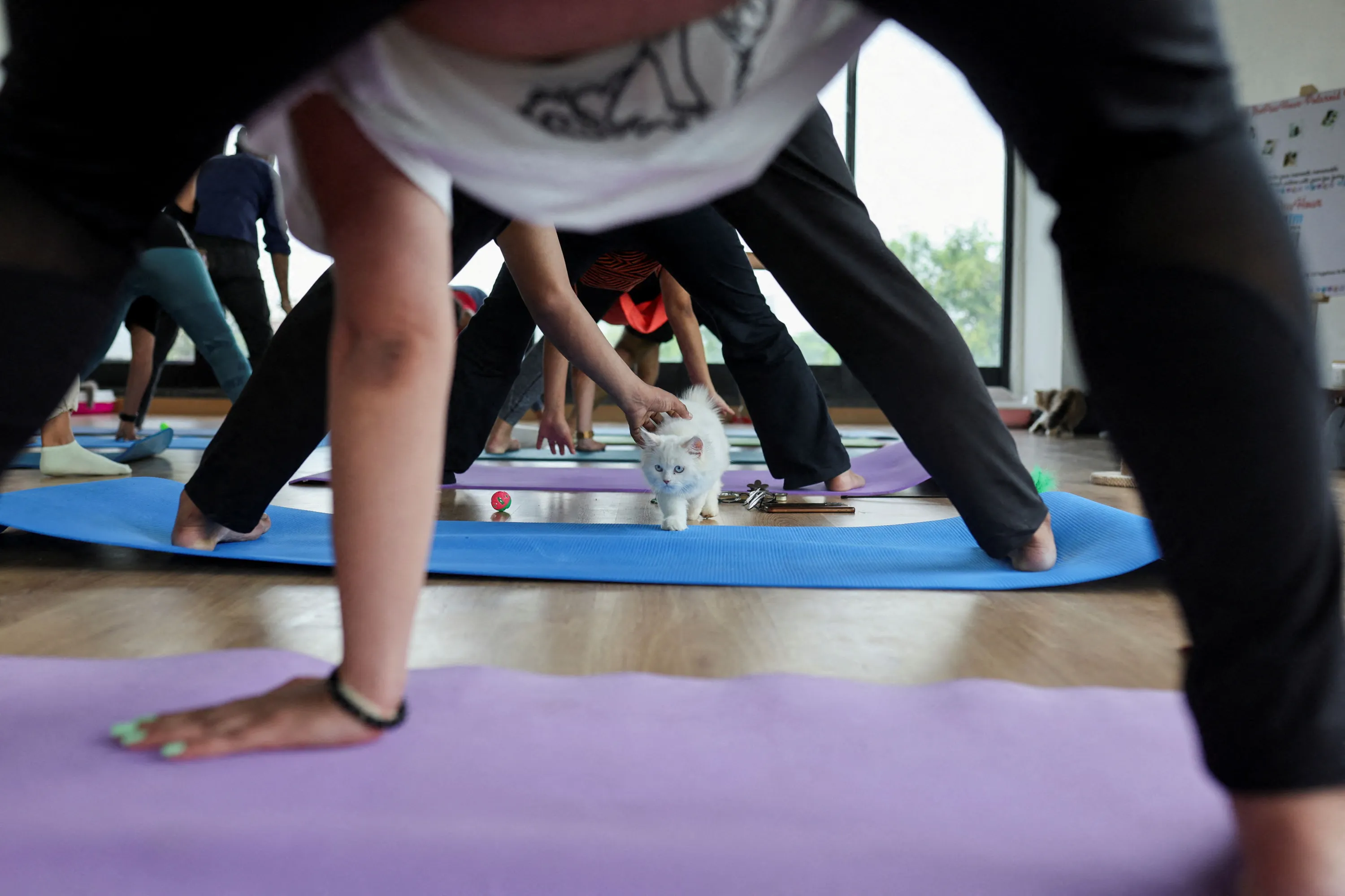 Participants perform yoga as the kittens play around them at a yoga session, which was organised by Pawhour, at a studio in New Delhi, India on August 6, 2023. (Photo by Anushree Fadnavis/Reuters)
