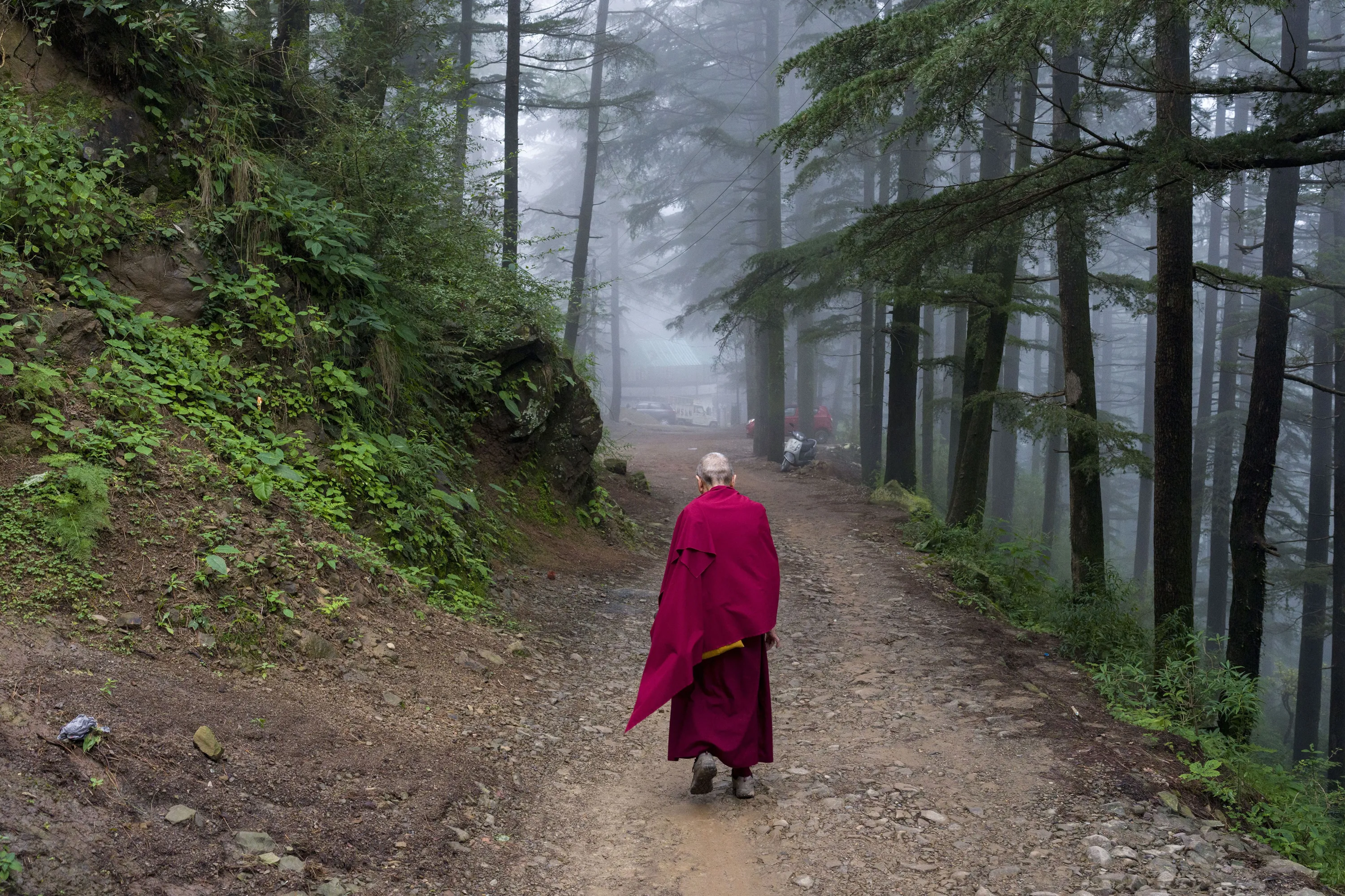 An exile Tibetan Buddhist monk walks on a mountain path in Dharamshala, India, Wednesday, August 9, 2023. (Photo by Ashwini Bhatia/AP Photo)