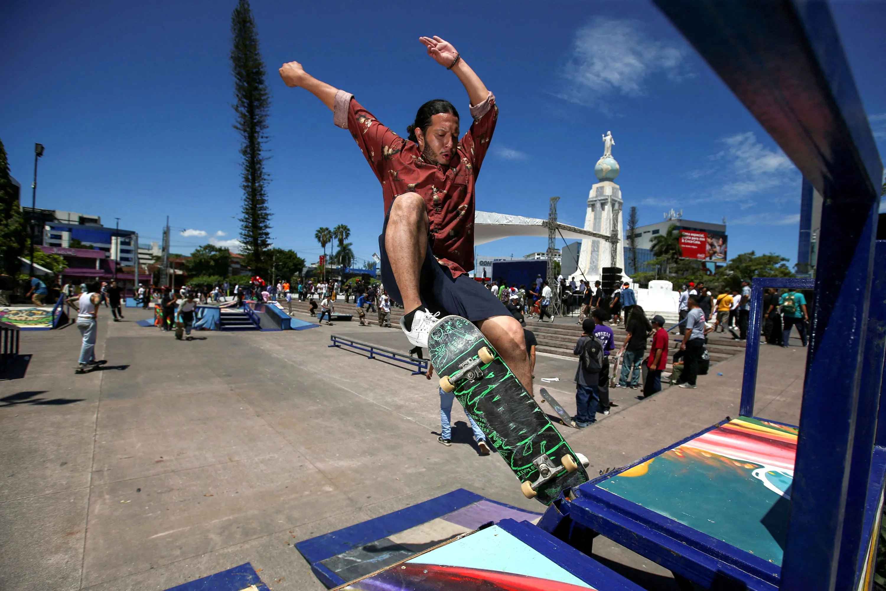 A skateboarder performs a trick during Go Skateboarding Day in San Salvador, El Salvador on June 18, 2023. (Photo by Jose Cabezas/Reuters)
