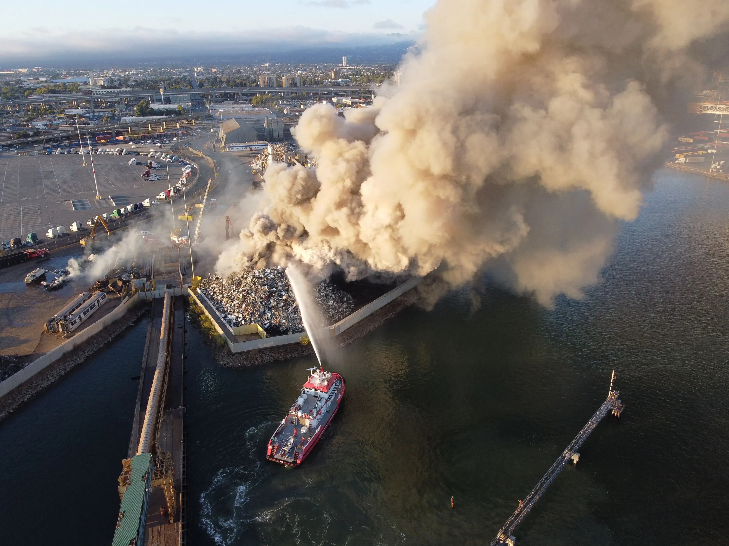A fire boat shoots water to combat the fire at the port of Oakland. On August 9th at 5:30 p.m., a fire breaks out at the port of Oakland, prompting an immediate response from the Oakland and Alameda Fire department. Firefighters and a fire boat are dispatched to the scene to combat the blaze. The fire generates a substantial amount of smoke, filling the air and casting a dense haze over the sky in the vicinity of the port. As a result of the fire's impact on air quality, an air quality advisory is issued for the East Bay of the San Francisco Bay Area. (Photo by Michael Ho Wai Lee/SOPA Images/Rex Features/Shutterstock)