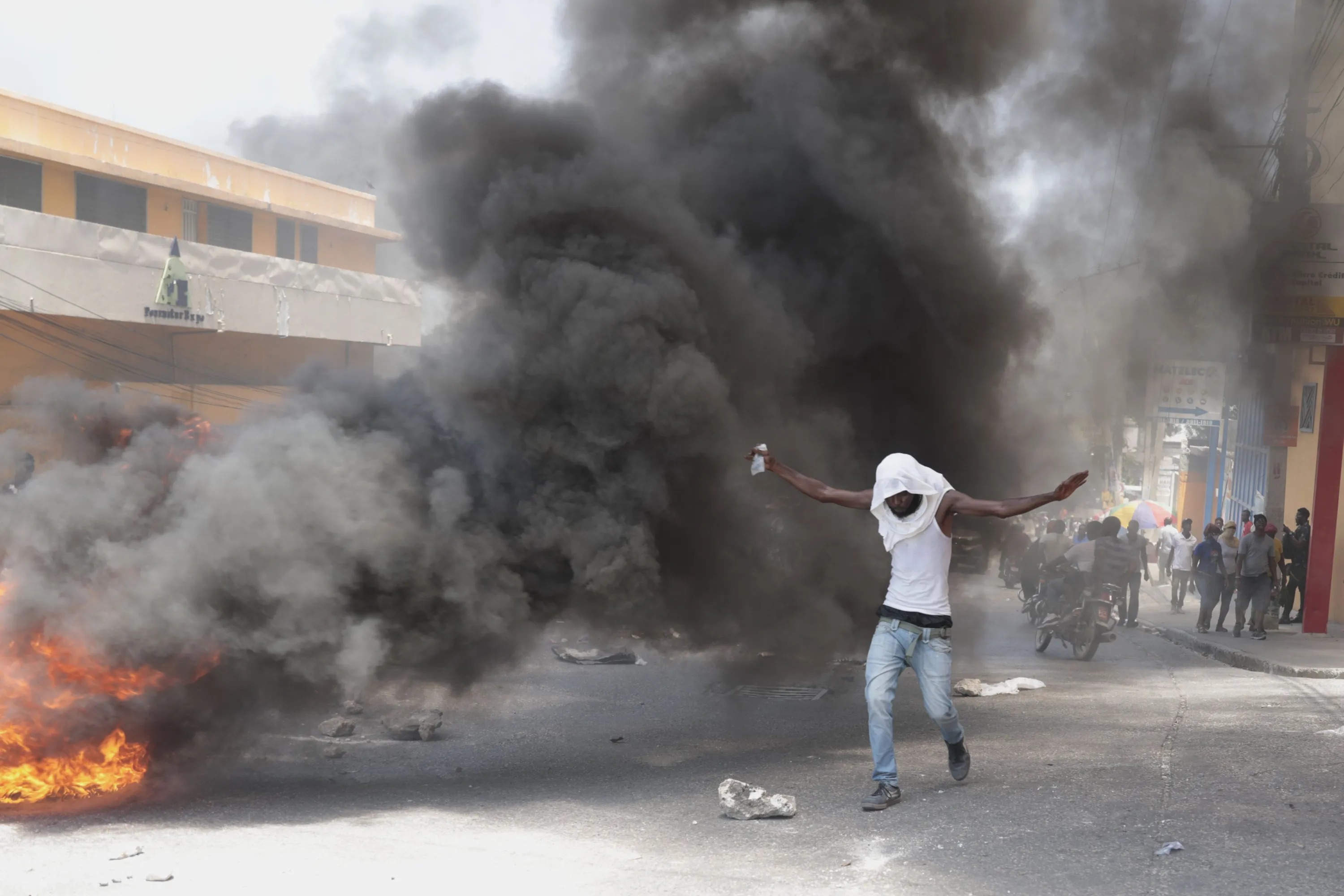 A protester walks past tires set fire by demonstrators protesting insecurity in Port-au-Prince, Haiti, Monday, August 7, 2023. (Photo by Joseph Odelyn/AP Photo)