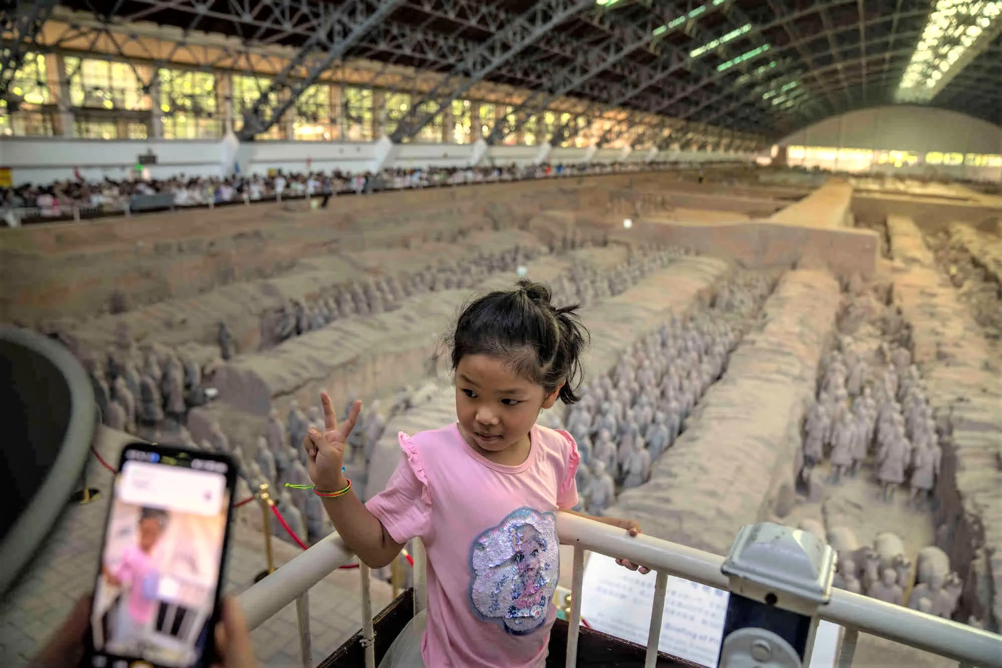 A girl poses for a photo in front of excavated figures on display at the Museum of Terracotta Warriors and Horses of Emperor Qin Shihuang in Xi'an in northwestern China's Shaanxi Province, Sunday, July 16, 2023. (Photo by Mark Schiefelbein/AP Photo)