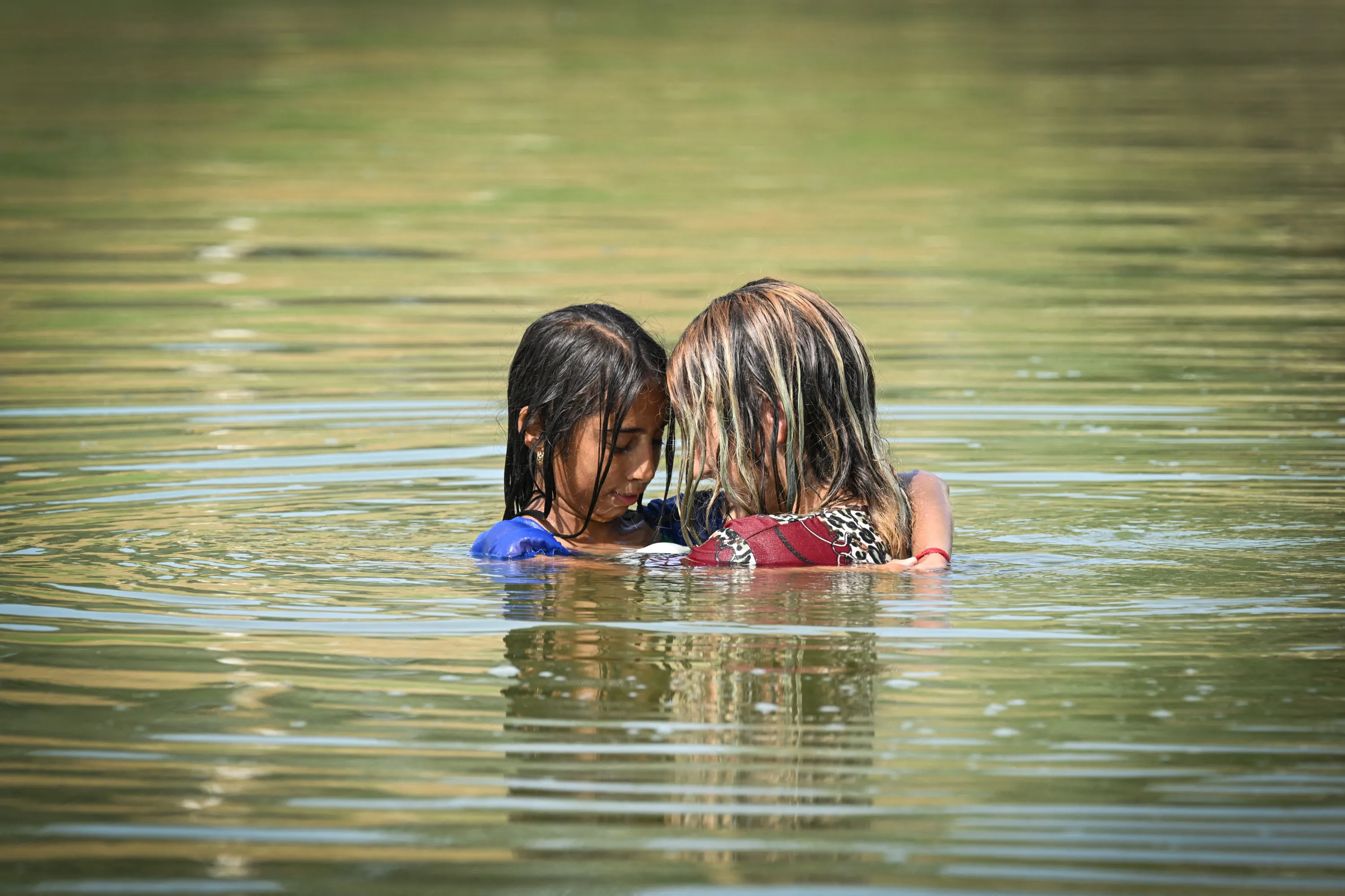 A woman and a young girl are seen in the water of an abandoned irrigation station in the Frasinet village in the Calarasi county, south-east of Bucharest, Romania, on July 25, 2023. A heat wave on July 25, 2023 has risen the temperatures in southern Romania up to 42 degrees Celsius. (Photo by Daniel Mihailescu/AFP Photo)