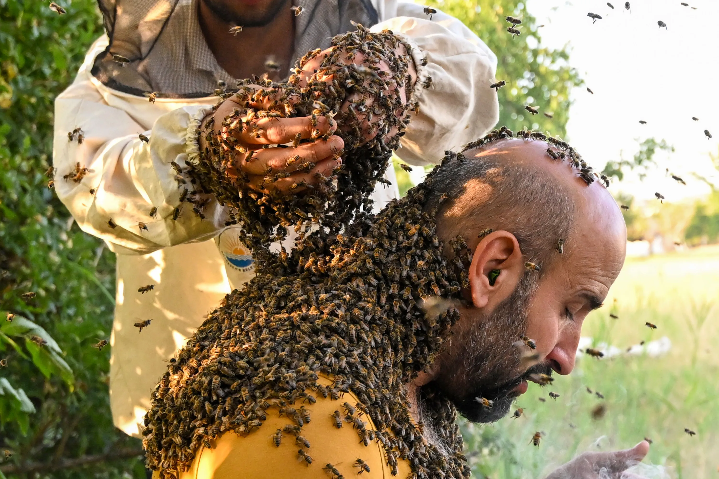 Beekeeper Abdulvahap Semo performs his attempt to set a bee wearing record in the Guinness World Records, in Van, Turkiye on July 12, 2023. Weighing the weight of the bees he collects on a scale, Abdulvahap aims to break the 'bee collecting record' of 63 kilograms in China. (Photo by Ozkan Bilgin/Anadolu Agency via Getty Images)