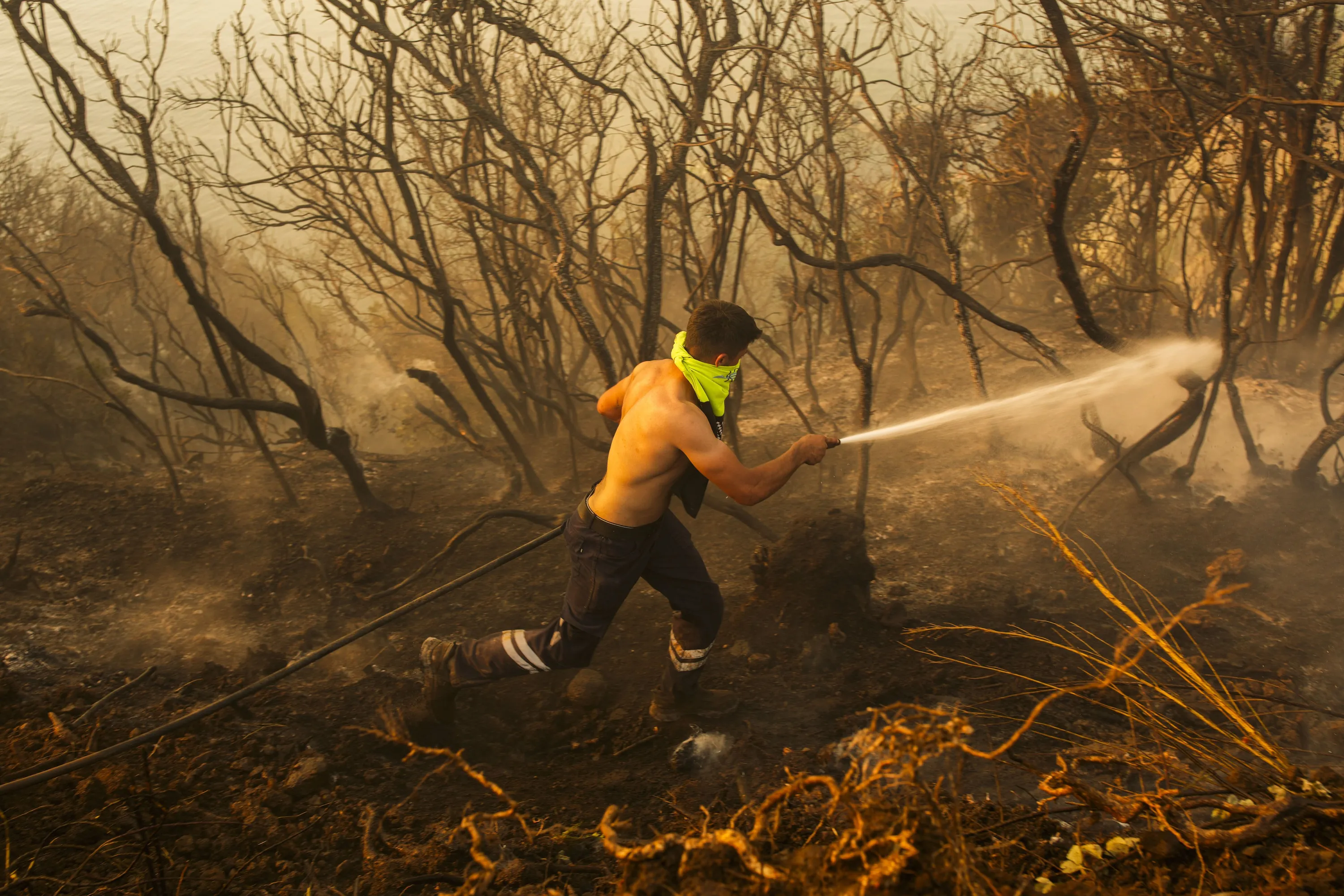 A Turkish firefighter works to extinguish a forest wildfire in Beykoz, outskirts Istanbul, Turkey, Wednesday, July 26, 2023. Water-dropping planes, helicopters and firefighters were also deployed to fight a blaze that broke out Wednesday at a forest near the district of Beykoz, in Istanbul, where temperatures reached 43 C. (Photo by Emrah Gurel/AP Photo)
