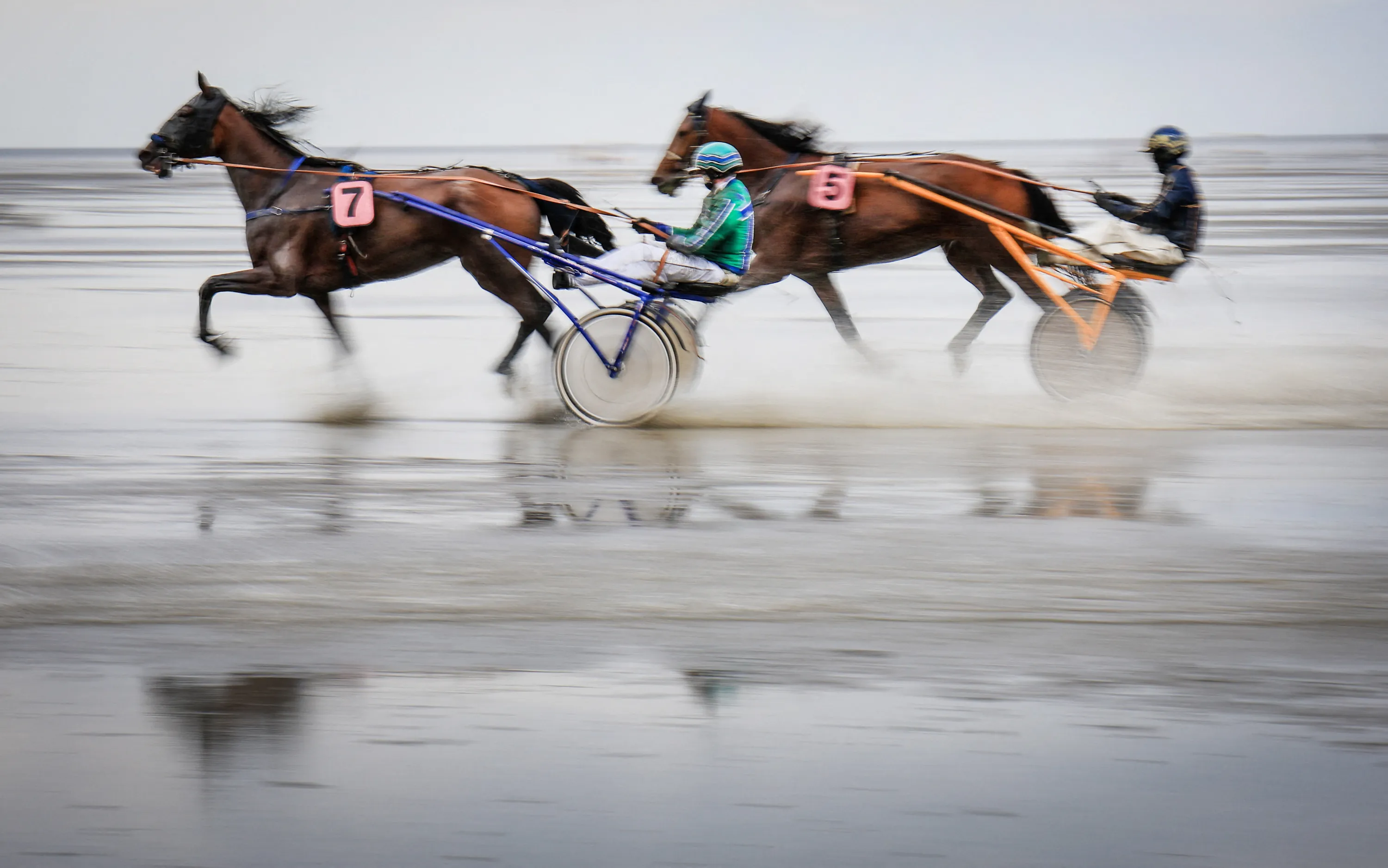 Trotters compete in the mudflats of the Elbe estuary during the Duhner Wattrennen horse racing day in Cuxhaven, northern Germany, on July 15, 2023. The races take place at low tide, making them a rare opportunity to see equestrian competitions on the seabed. (Photo by Focke Strangmann/AFP Photo)