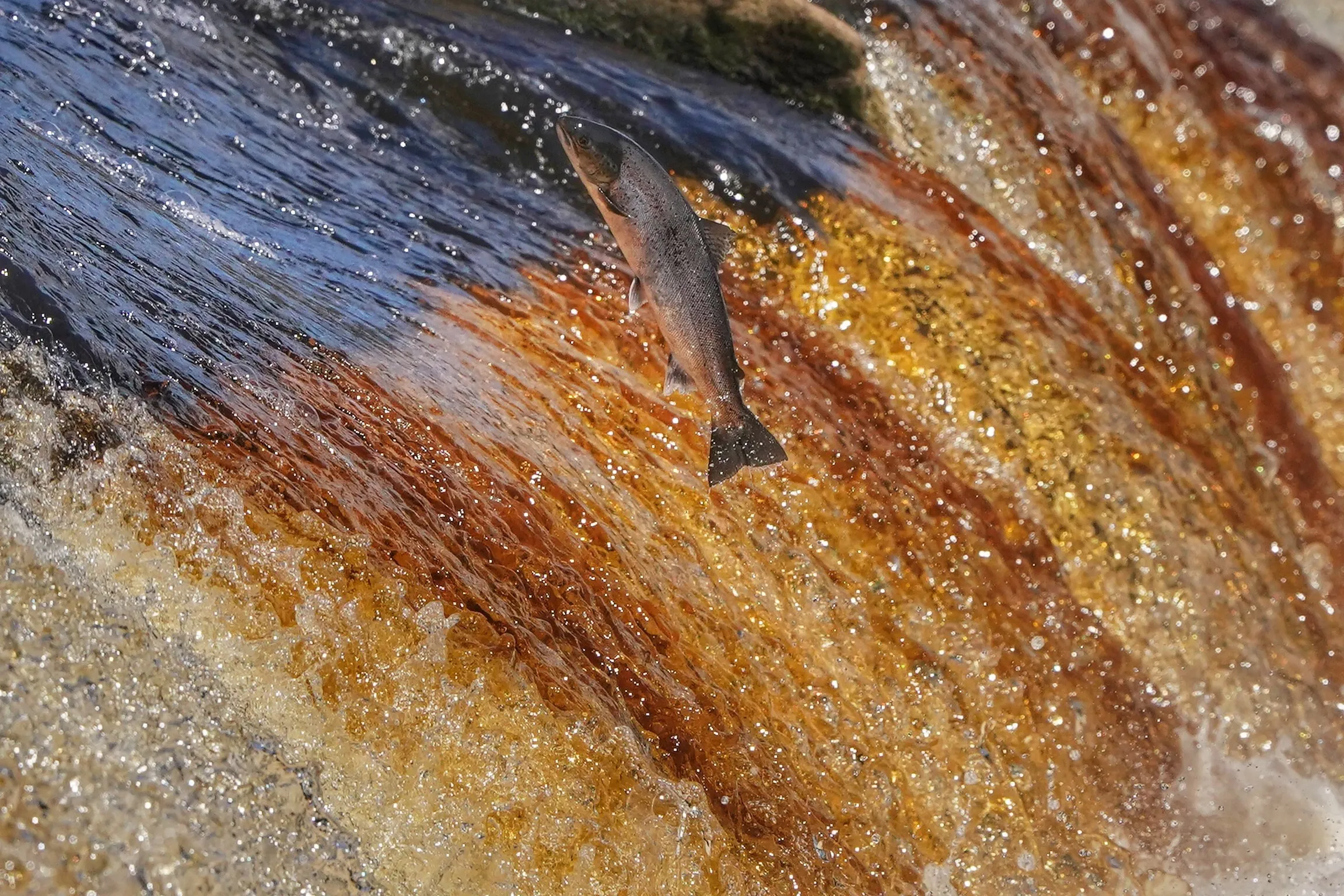 A salmon leaps up the weir of the River Tyne near Hexham in Northumberland, UK on Saturday, July 29, 2023. (Photo by Owen Humphreys/PA Images via Getty Images)