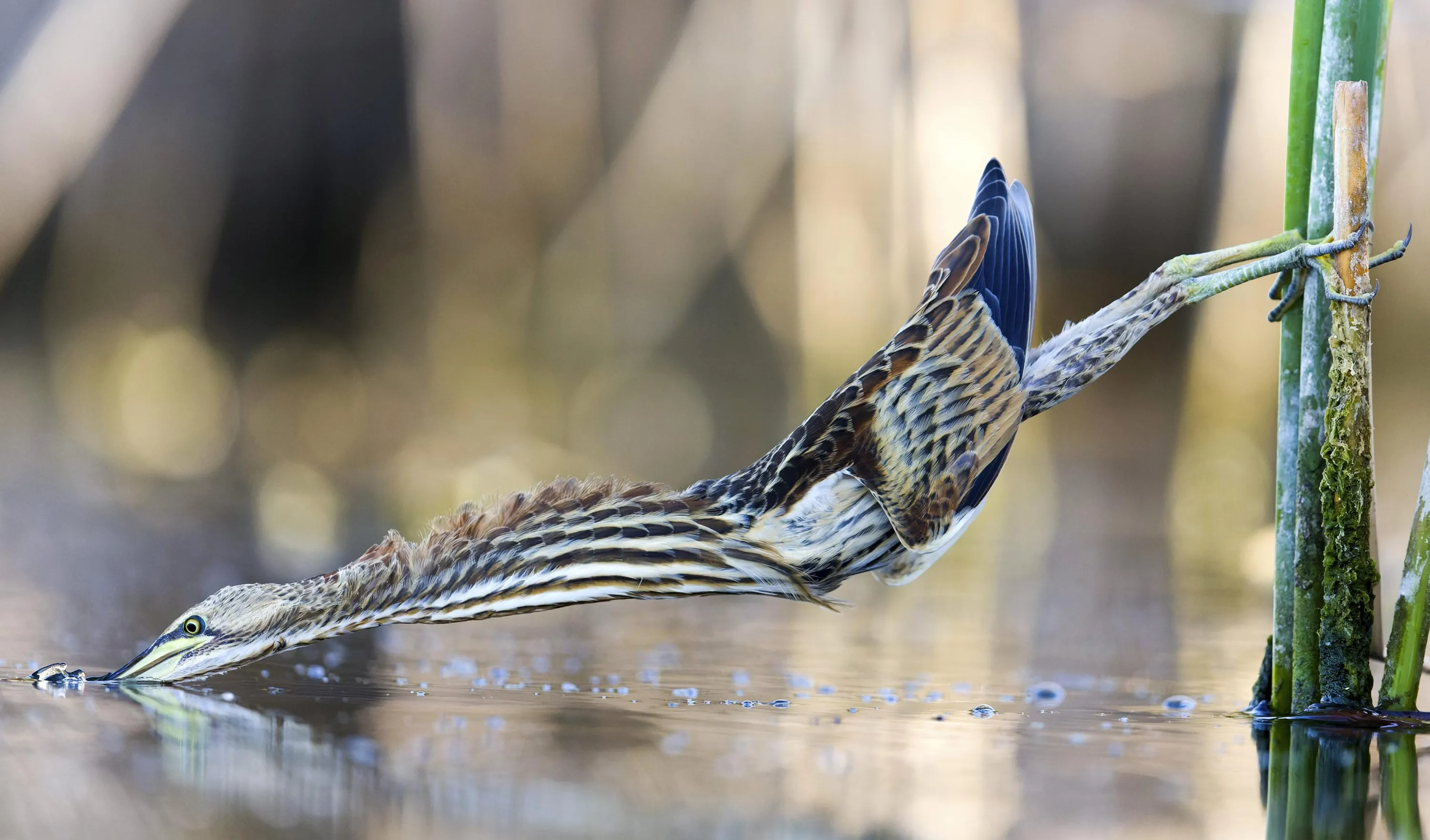 A juvenile bittern goes full stretch to pluck a fish from the water in Toledo, central Spain early August 2023. (Photo by Paul Sawer/Solent News)