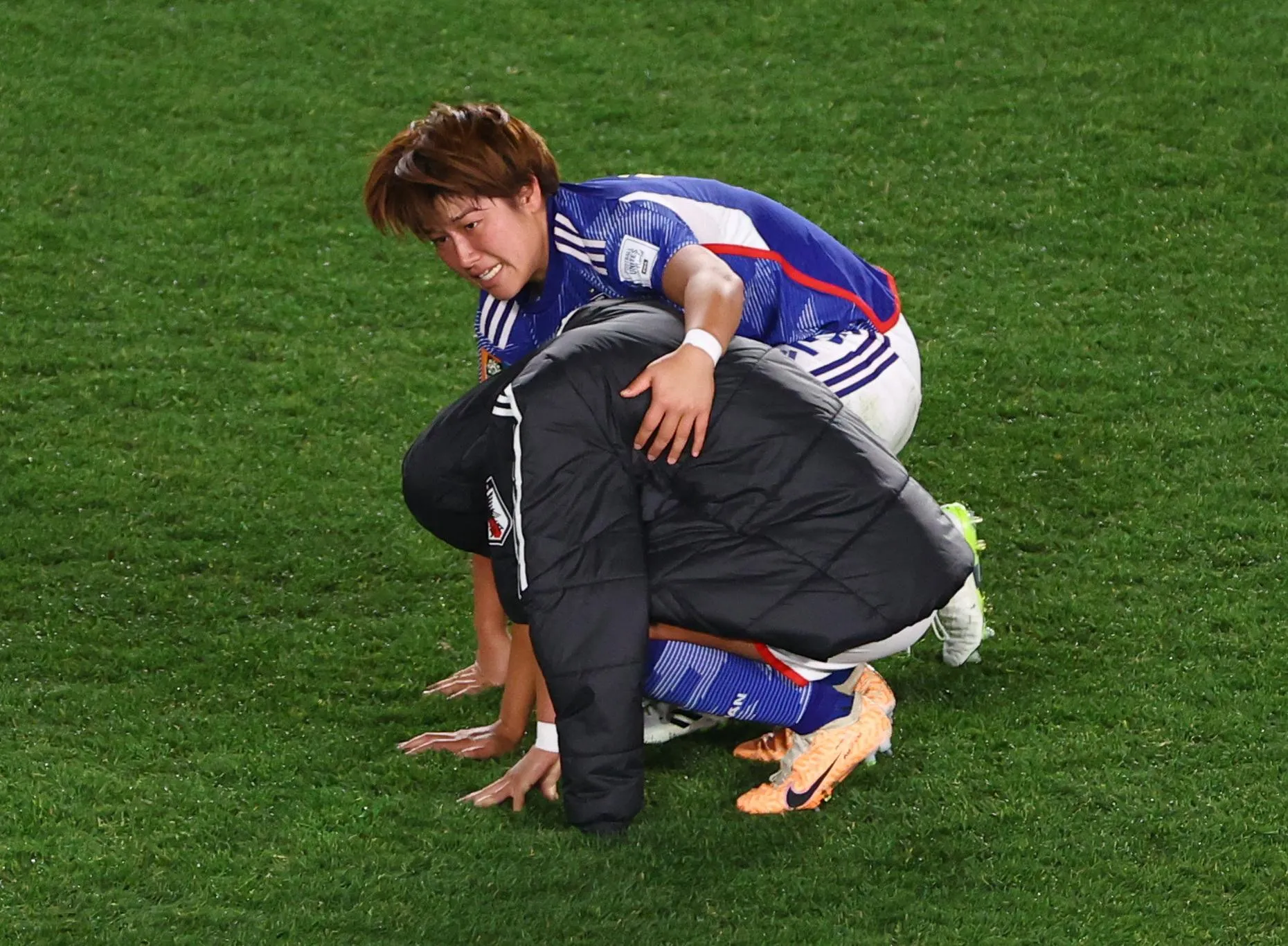 Japan's defender #12 Hana Takahashi consoles a teammate after being knocked out of the World Cup during the Australia and New Zealand 2023 Women's World Cup quarter-final football match between Japan and Sweden at Eden Park in Auckland on August 11, 2023. (Photo by Hannah Mckay/Reuters)