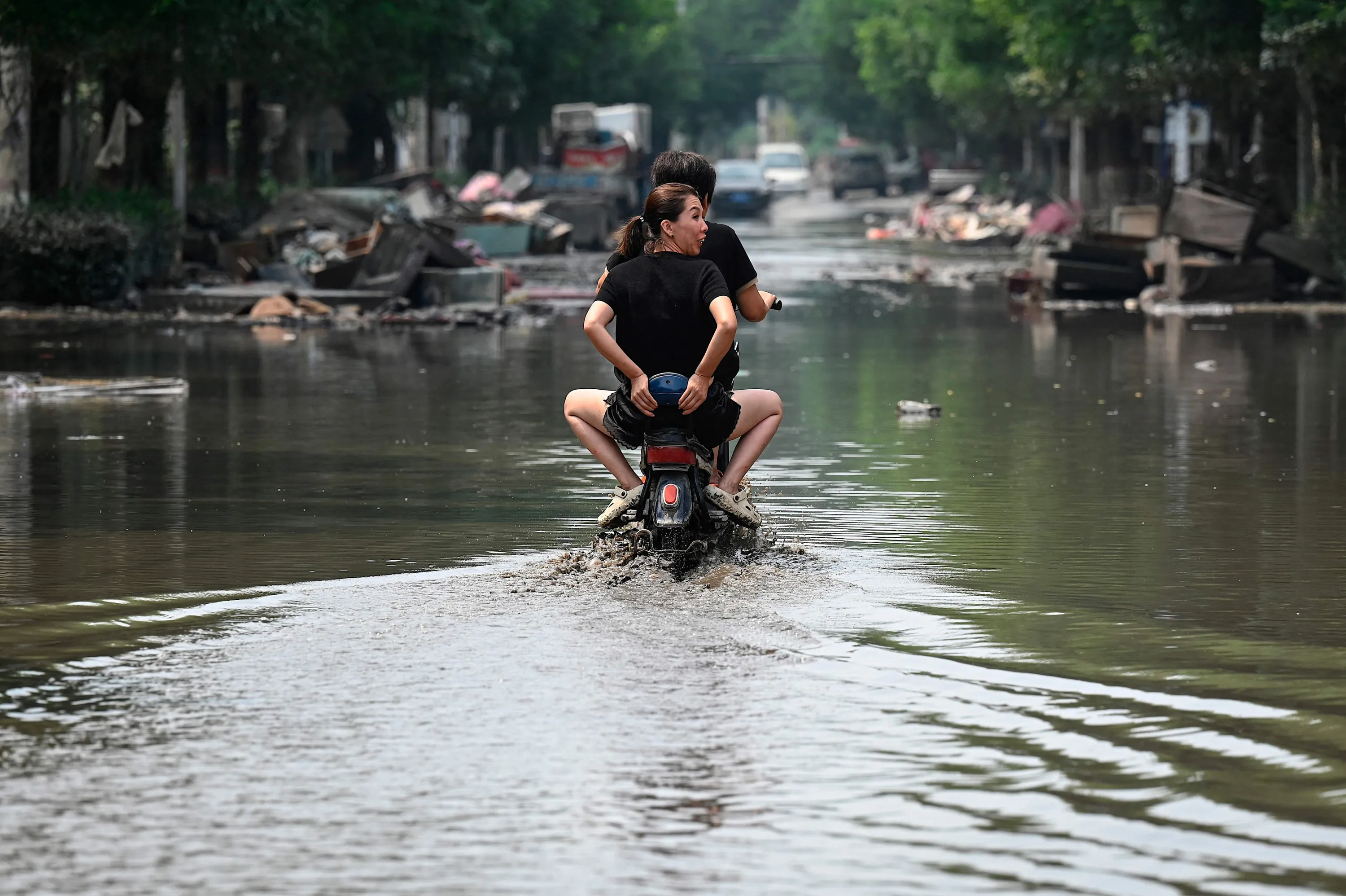 Local residents ride a scooter on a flooded street in the aftermath of flooding from heavy rains in Zhuozhou city, in northern China’s Hebei province on August 9, 2023. China's capital has been hit by record downpours in recent weeks, damaging infrastructure and deluging swaths of the city's suburbs and surrounding areas. In Hebei province, which neighbours Beijing, 15 were reported to have died and 22 were missing. (Photo by Jade Gao/AFP Photo)