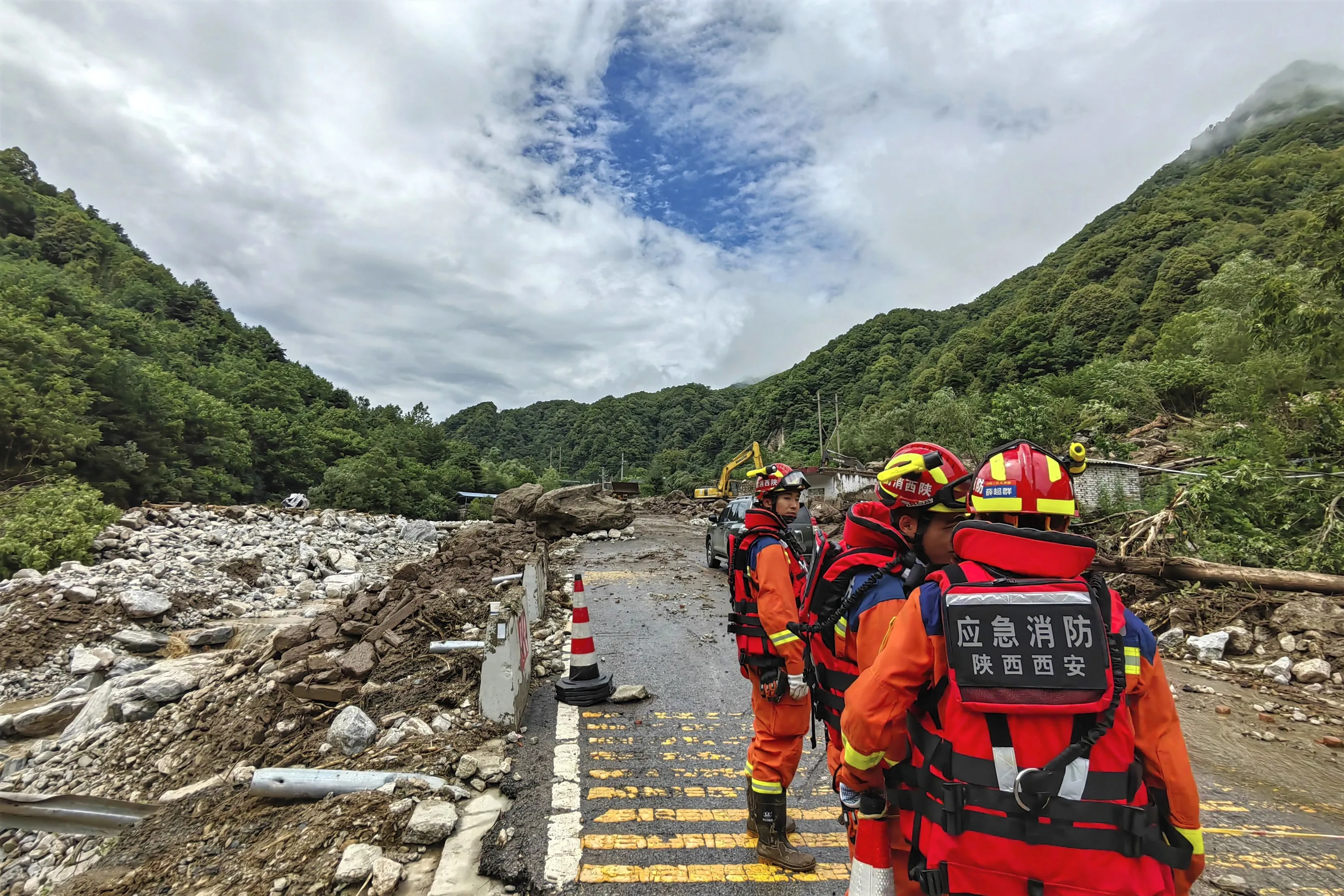 In this photo released by Xinhua News Agency, rescue workers gather at the aftermath of a mudslide in Weiziping village of Luanzhen township on the outskirts of Chang'an district, Xi'an of northwestern China's Shaanxi Province on Saturday August 12, 2023. The mudslide caused by torrential rains killed at least two people on the outskirts of Xi'an in western China, an official news agency said Saturday, while some trains in the northeast were canceled as a powerful storm lashed the region. (Photo by Zhang BinXinhua via AP Photo)