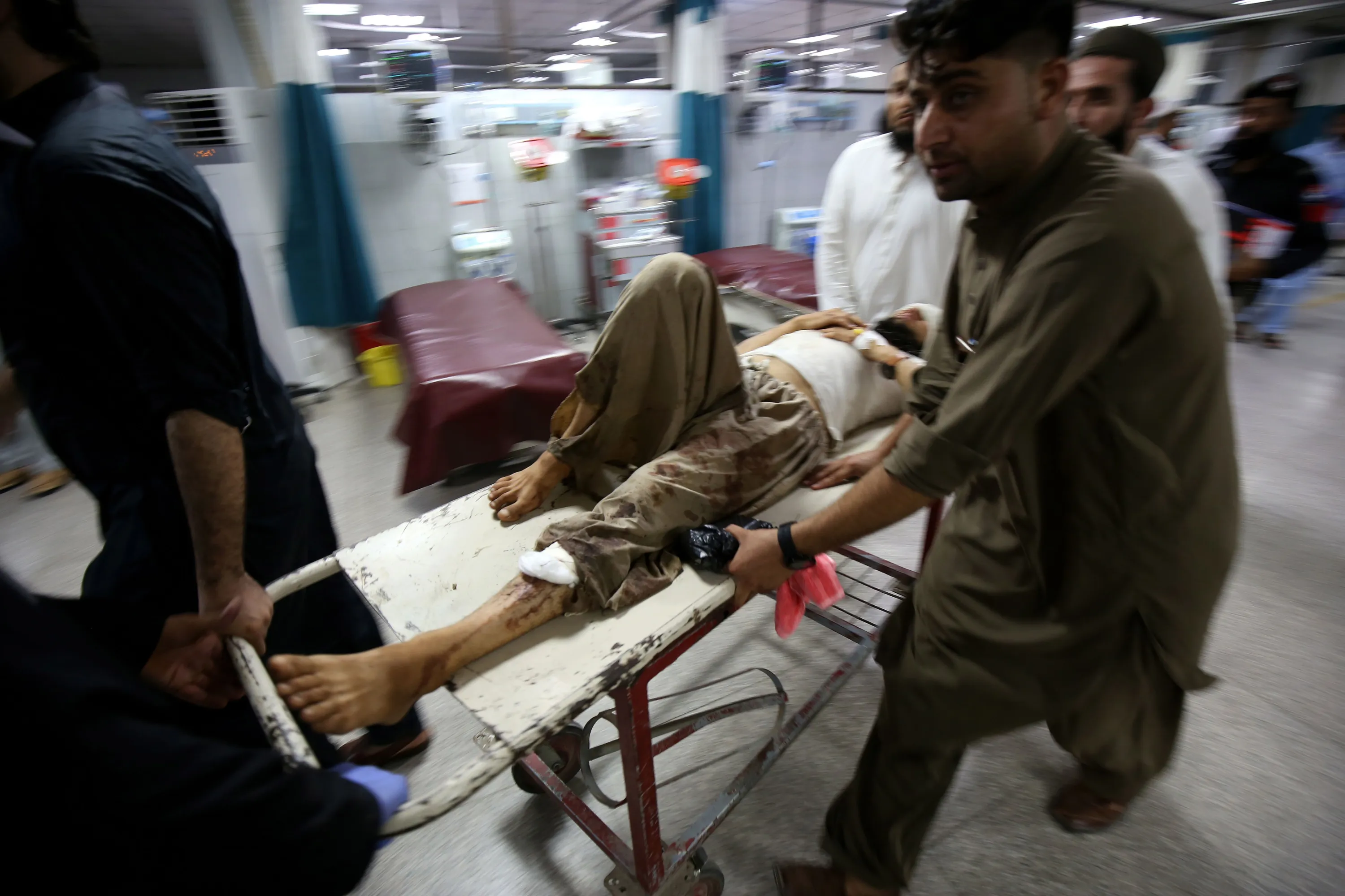 An injured man is shifted to a hospital following a blast targeting a gathering of Islamic political party Jamiat Ulma-e-Islam (JUI-F), in Peshawar, Pakistan, 30 July 2023. At least 40 people were killed and several injured in an explosion at the JUI-F workers convention in Khar, police said. (Photo by Arshad Arbab/EPA)
