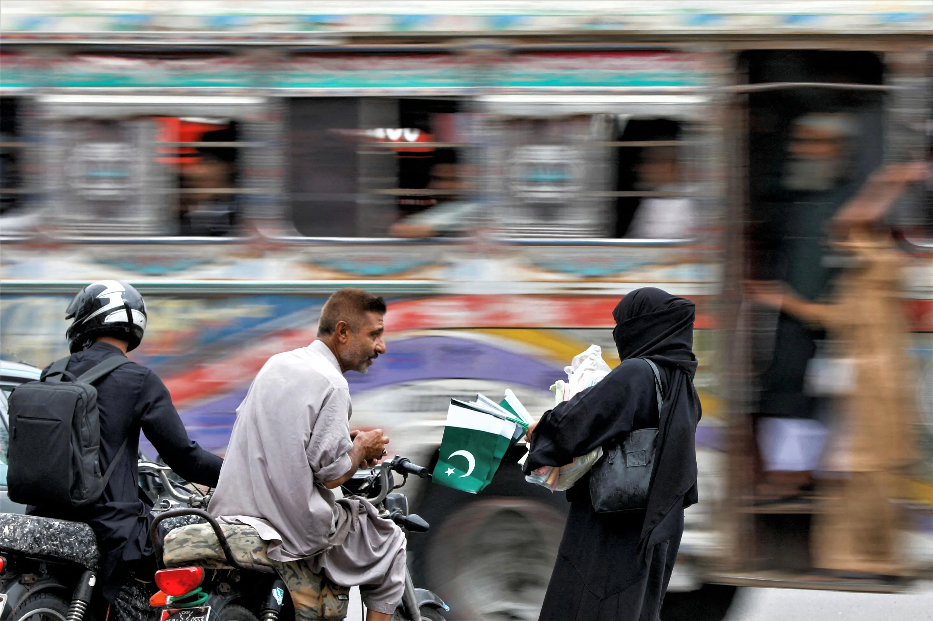 A woman speaks with a customer while selling national flags, ahead of Pakistan's Independence Day, along a road in Karachi, Pakistan on August 10, 2023. (Photo by Akhtar Soomro/Reuters)