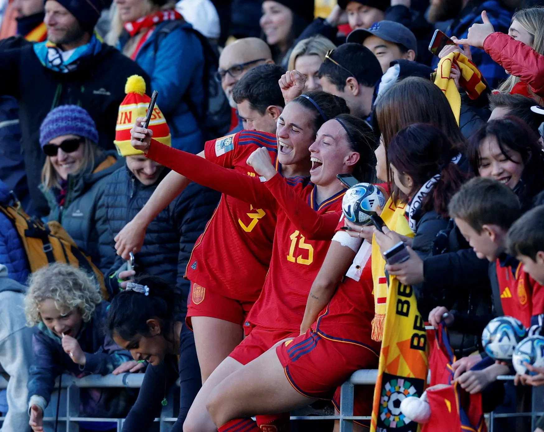 Spain's Teresa Abelleira and Eva Navarro celebrate with fans after quarter final match against Netherlands and progressing to the semi finals of the Women's World Cup, in Wellington, New Zealand on August 11, 2023. (Photo by Amanda Perobelli/Reuters)