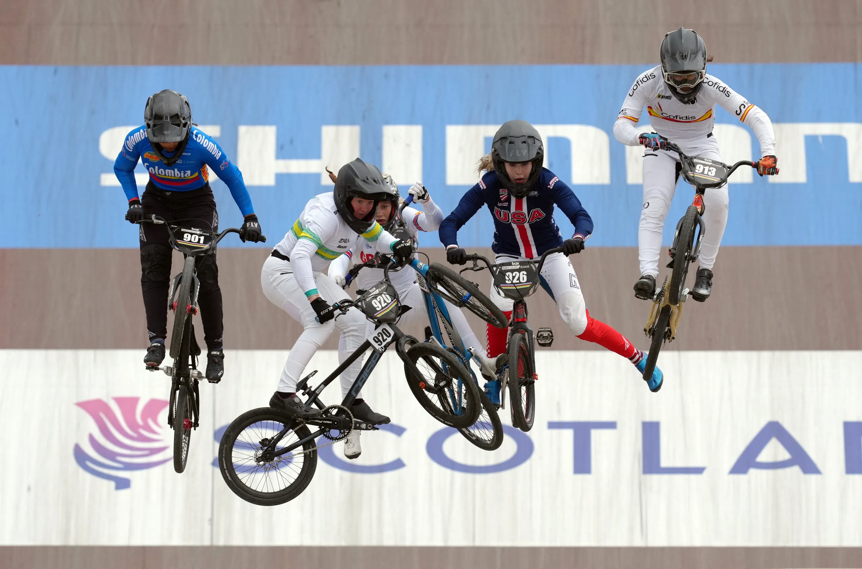 Australia's Sienna Pal, Keiley Shea of the US and Britain's Sienna Harvey crash during the BMX CUCI World Championships in Glasgow, Scotland on August 13, 2023. (Photo by Maja Smiejkowska/Reuters)
