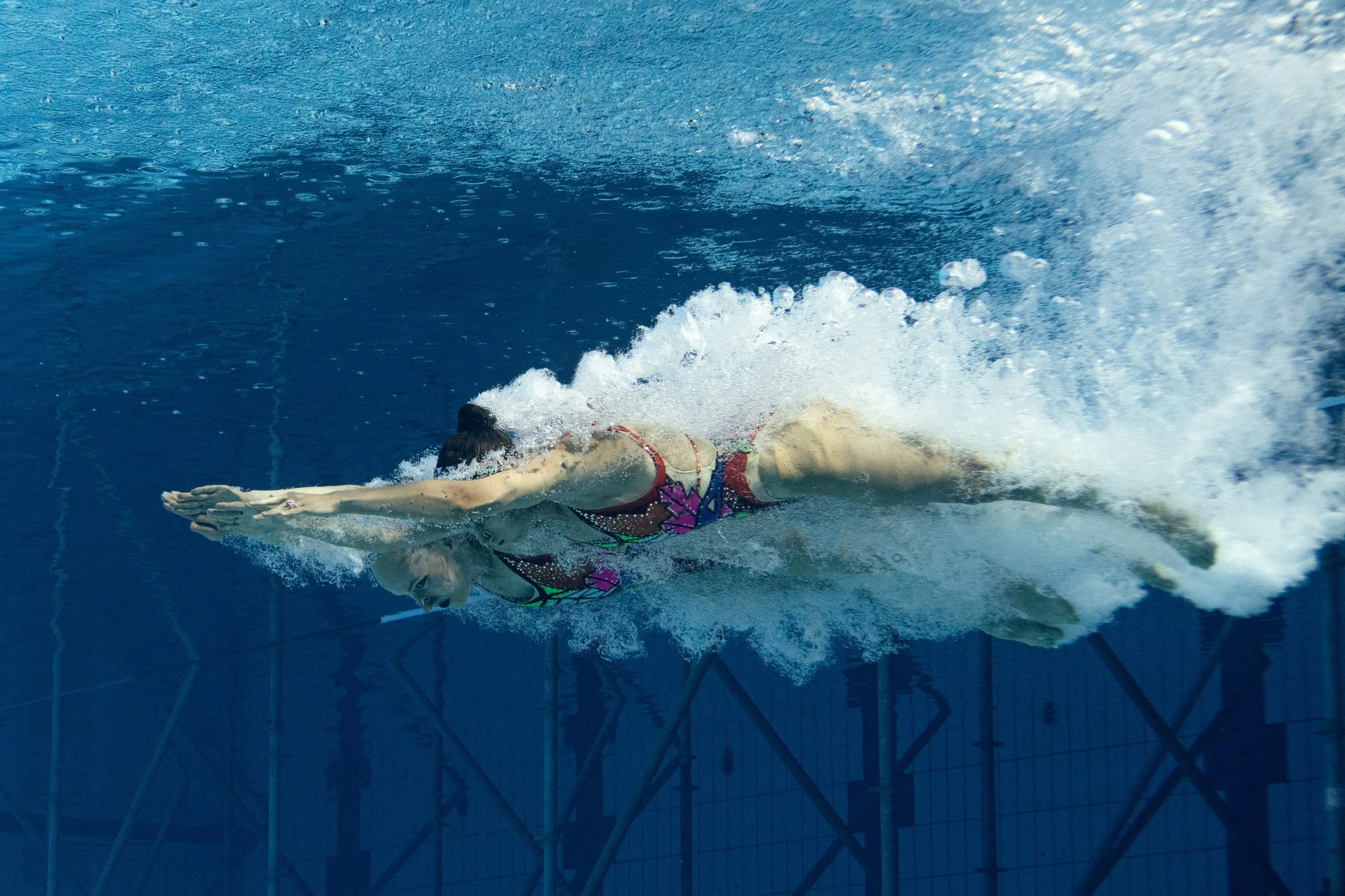 Germany's Marlene Bojer and Germany's Michelle Zimmer compete in the preliminaries for the women's duet technical artistic swimming event during the Budapest 2022 World Aquatics Championships at the Alfred Hajos Swimming Complex in Budapest on June 17, 2022. (Photo by Oli Scarff/AFP Photo)
