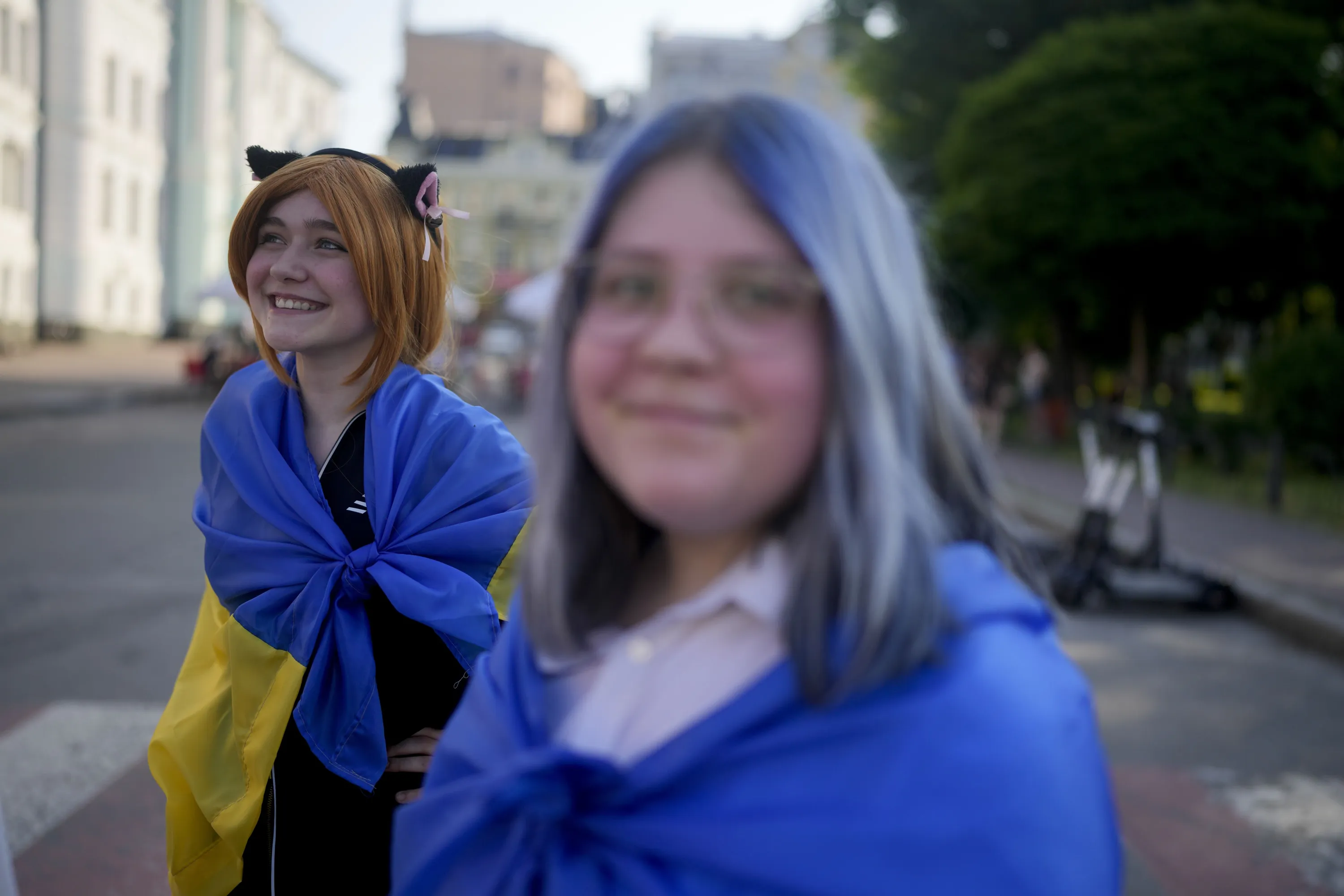 Women wrapped in Ukrainian flags smile in Kyiv, Ukraine, Friday, June 10, 2022. With war raging on fronts to the east and south, the summer of 2022 is proving bitter for the Ukrainian capital, Kyiv. The sun shines but sadness and grim determination reign. (Photo by Natacha Pisarenko/AP Photo)