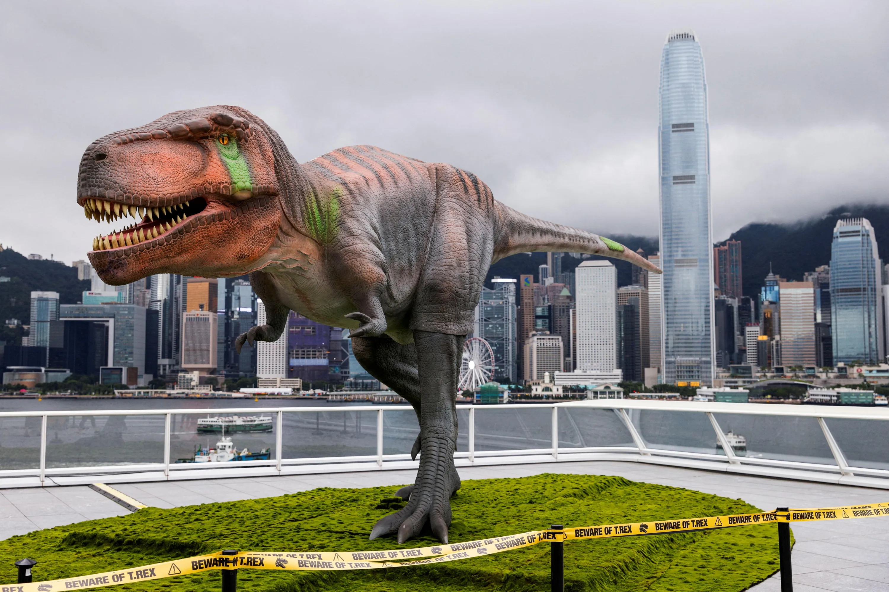 A 4.6 meters high robotic Tyrannosaurus rex (T-Rex) dinosaur installation is pictured in front of the Victoria Harbour during a promotional event in Hong Kong, China, June 6, 2022. (Photo by Tyrone Siu/Reuters)
