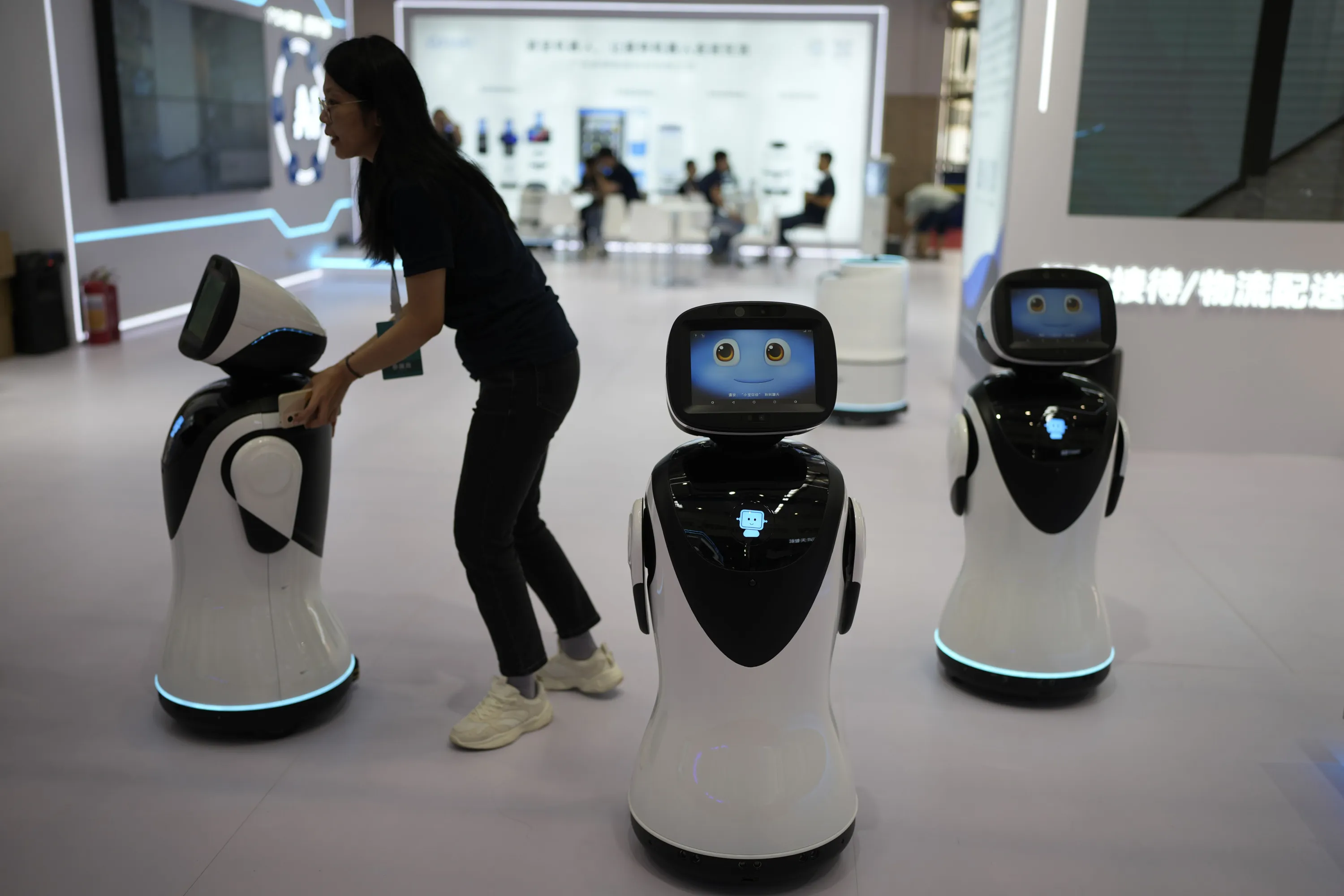 A woman pushes robots around at the annual World Robot Conference at the Beijing Etrong International Exhibition and Convention Center, Wednesday, August 16, 2023. (Photo by Ng Han Guan/AP Photo)