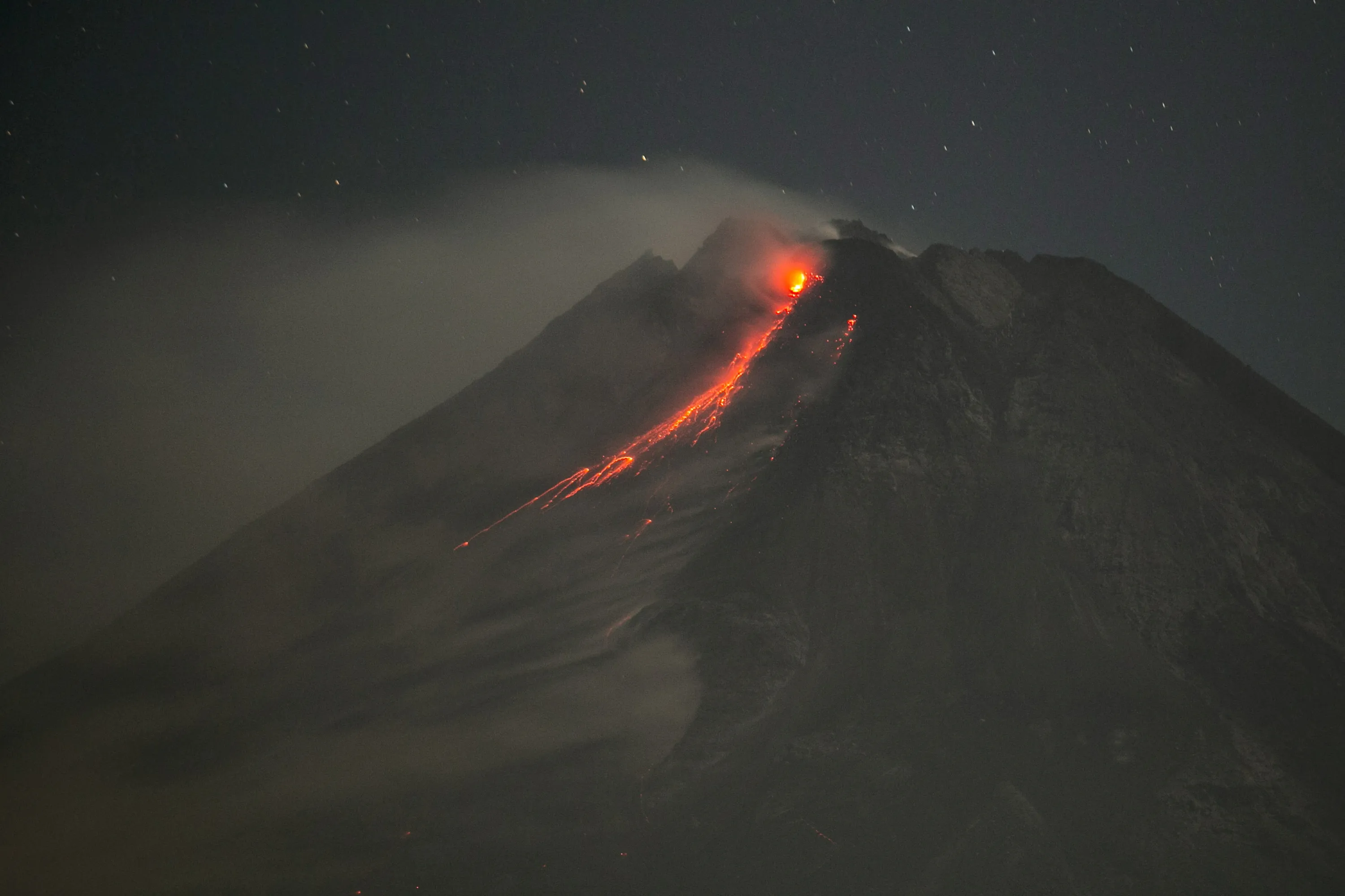 Mount Merapi volcano spews hot lava and smoke as seen from Turi, Sleman, in Yogyakarta, Indonesia on August 5, 2023, in this photo taken by Antara Foto. (Photo by endra Nurdiyansyah/Antara Foto via Reuters)