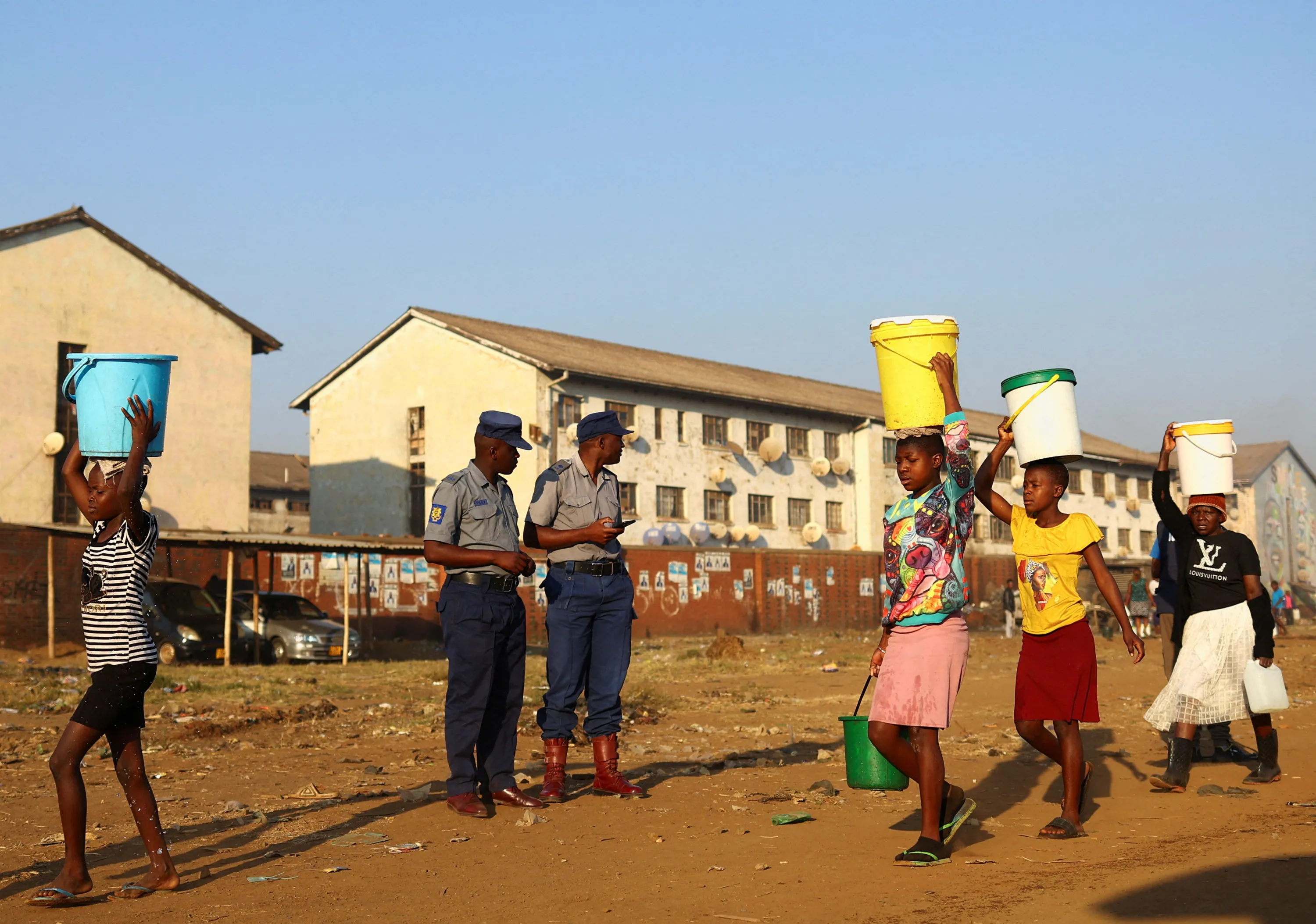 Police officers look on as women walk past carrying buckets filled with water ahead of the presidential elections in Mbare township, in Zimbabwe on August 22, 2023. (Photo by Siphiwe Sibeko/Reuters)