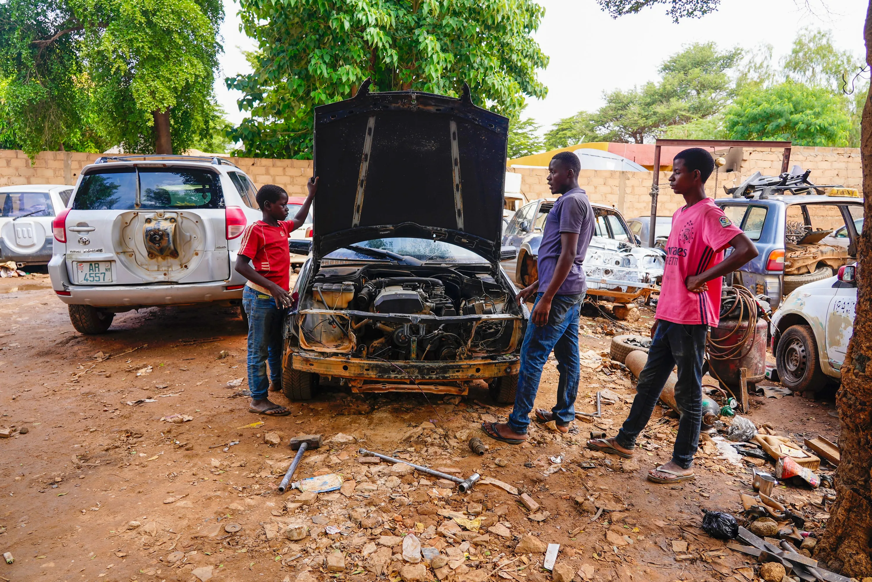 Mechanics work on a car in Niamey, Niger, Friday, August 18, 2023. Niger, an impoverished country of some 25 million people, was seen as one of the last countries that Western nations could partner with in Africa's Sahel region to beat back a jihadi insurgency linked to al-Qaida and the Islamic State group. Before last month's coup, Europe and the United States had poured hundreds of millions of dollars into propping up its military. (Photo by Sam Mednick/AP Photo)