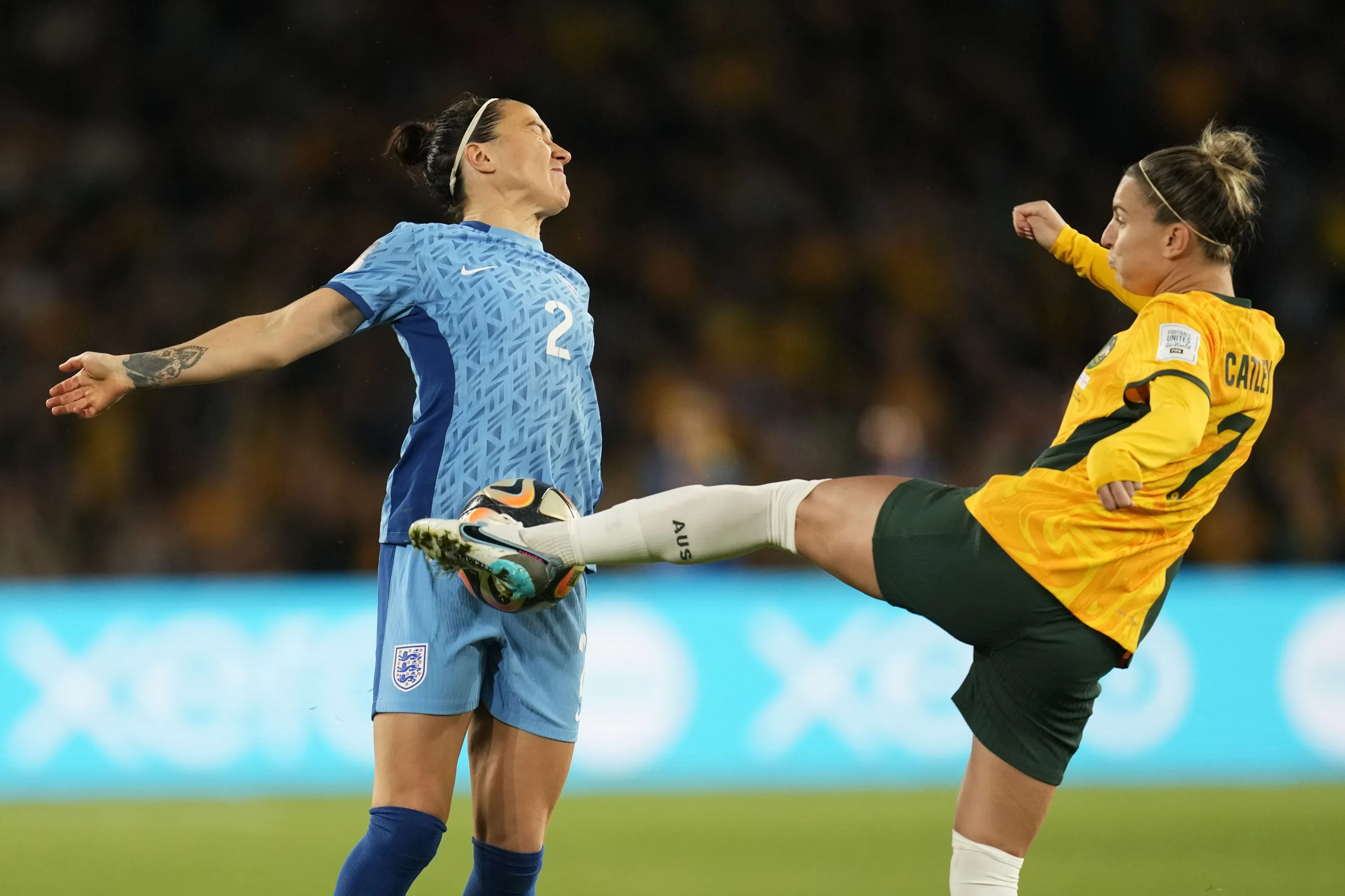 Australia's Steph Catley, right, and England's Lucy Bronze challenge for the ball during the Women's World Cup semifinal soccer match between Australia and England at Stadium Australia in Sydney, Australia, Wednesday, August 16, 2023. (Photo by Abbie Parr/AP Photo)