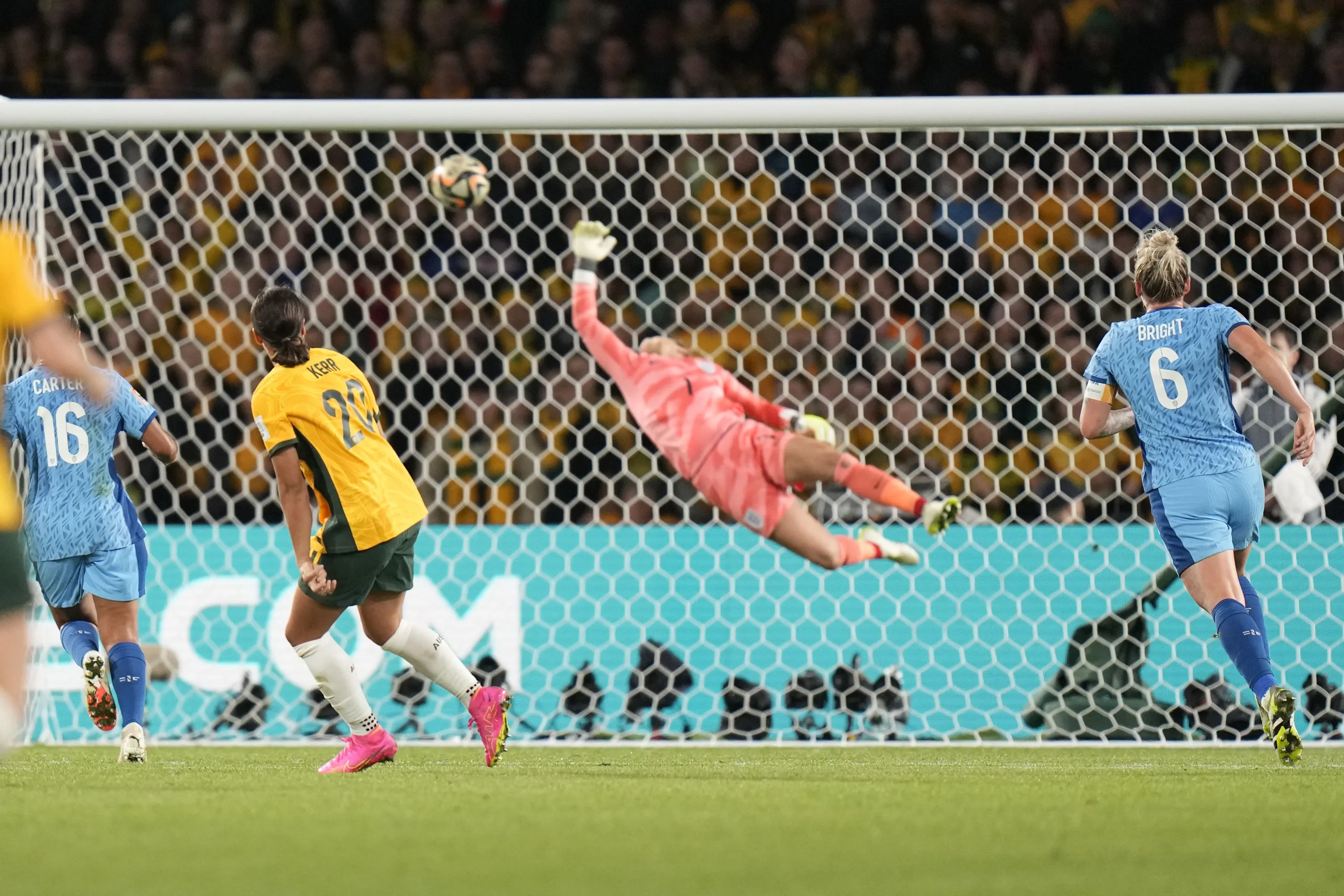 Australia's Sam Kerr scores her side's opening goal during the Women's World Cup semifinal soccer match between Australia and England at Stadium Australia in Sydney, Australia, Wednesday, August 16, 2023. (Photo by Alessandra Tarantino/AP Photo)