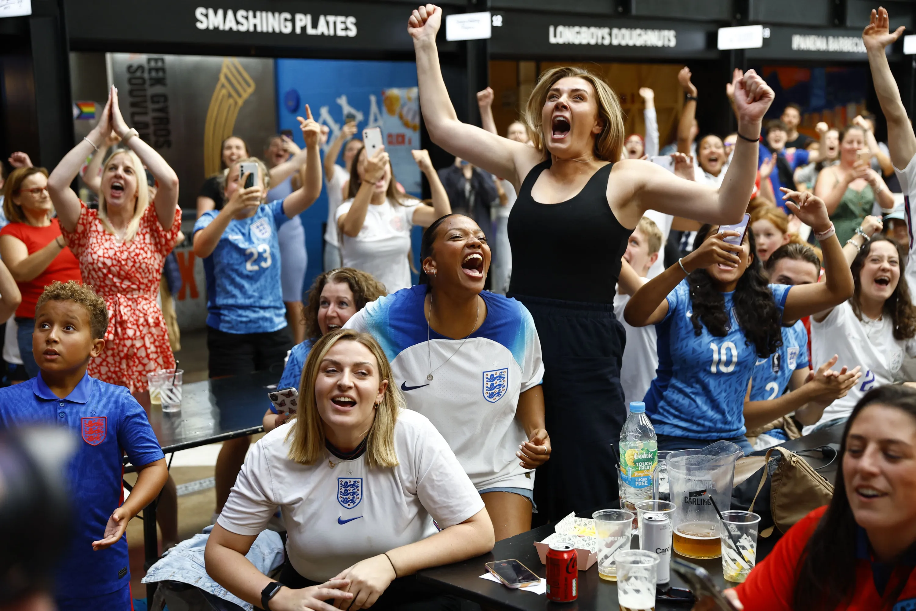 England fans celebrate following a screening of the FIFA Women's World Cup 2023 semi-final at BOXPARK Wembley, London on Wednesday, August 16, 2023. England will play Spain in the final of the Women's World Cup on Sunday after beating co-hosts Australia 3-1 in the semi-final in Sydney. (Photo by Peter Cziborra/Reuters)