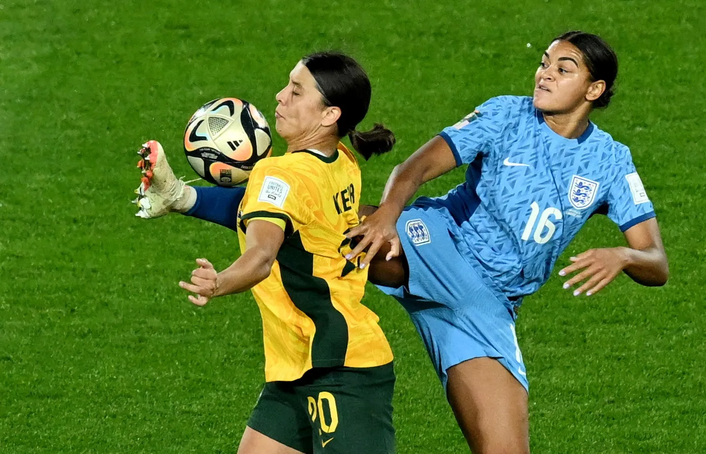 England's Jess Carter and Australia's Sam Kerr battle for the ball in the air during the FIFA Women's World Cup semi-final match at Stadium Australia, Sydney on Wednesday, August 16, 2023. (Photo by Jaimi Joy/Reuters)