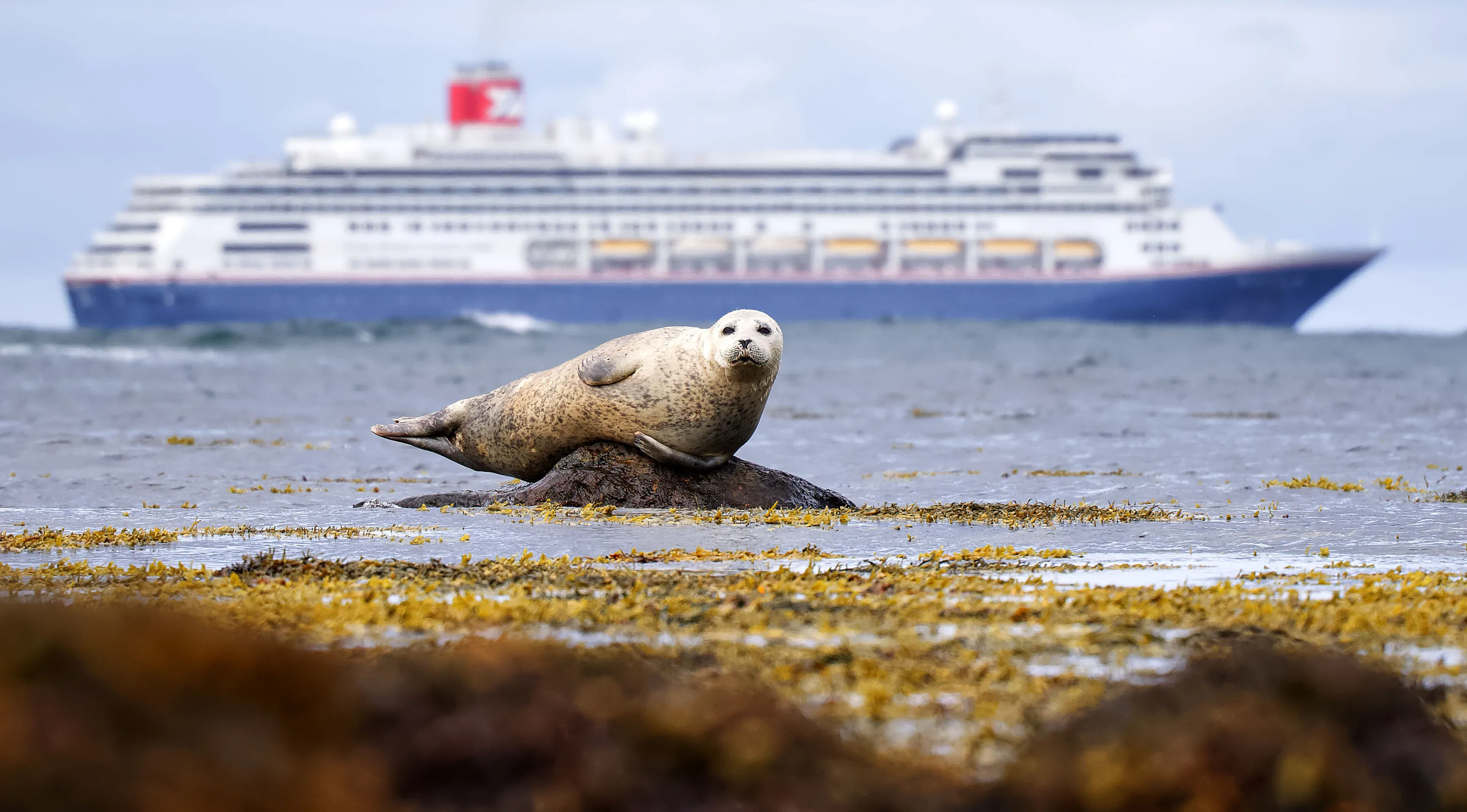A seal infront of a passing cruise ship on the shore between Sandhaven village and Fraserburgh in Scotland in August 2023. (Photo by Mark Grant/Caters News Agency)