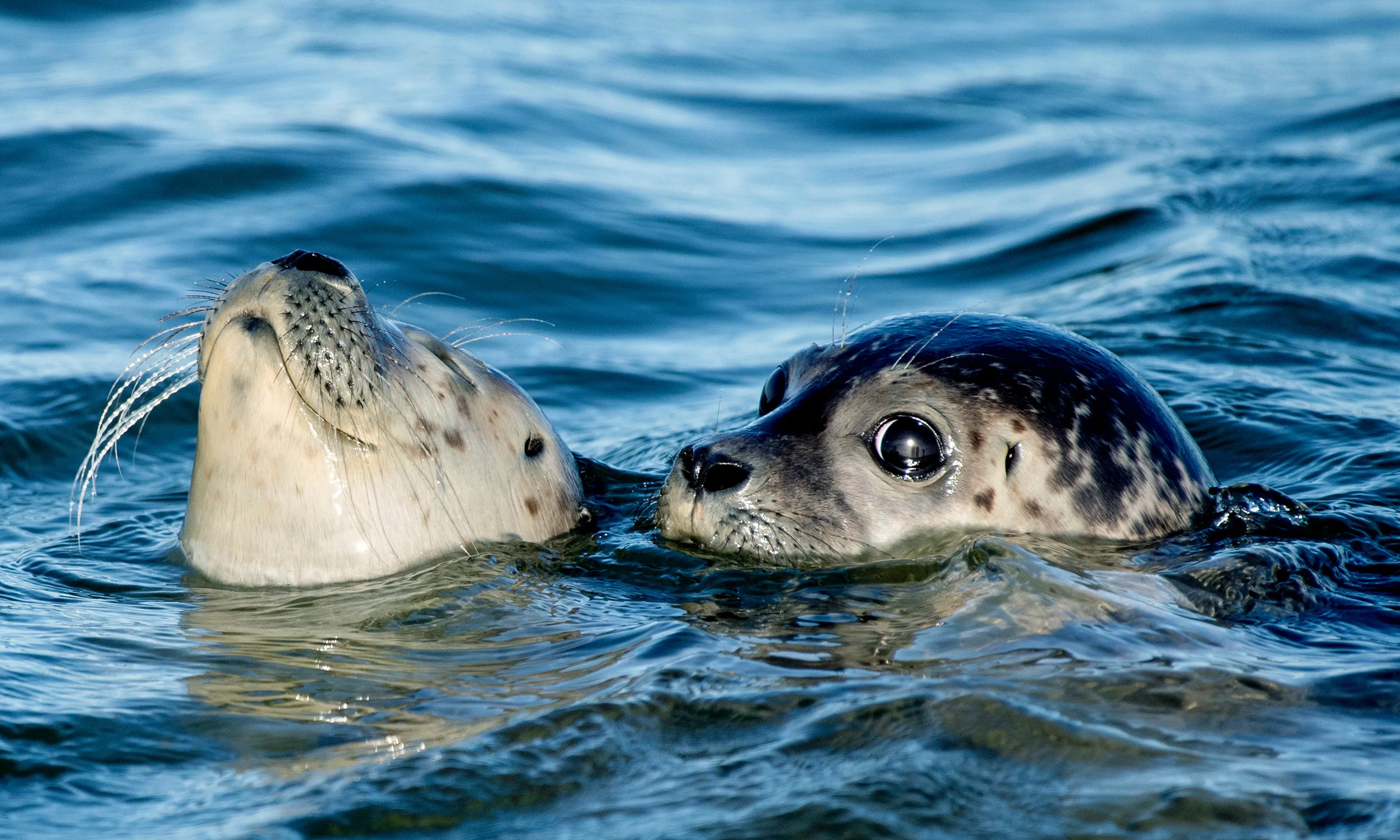 Two seals swim in the North Sea at the east end of the island of Juist in Lower Saxony on August 16, 2023. After a successful breeding in the seal station Norddeich, the four seals Mokki, Berthold, Choupinette and Fine have been released into the wild. They were brought to the East Frisian island of Juist by ship and released there. (Photo by Hauke-Christian Dittrich/dpa)