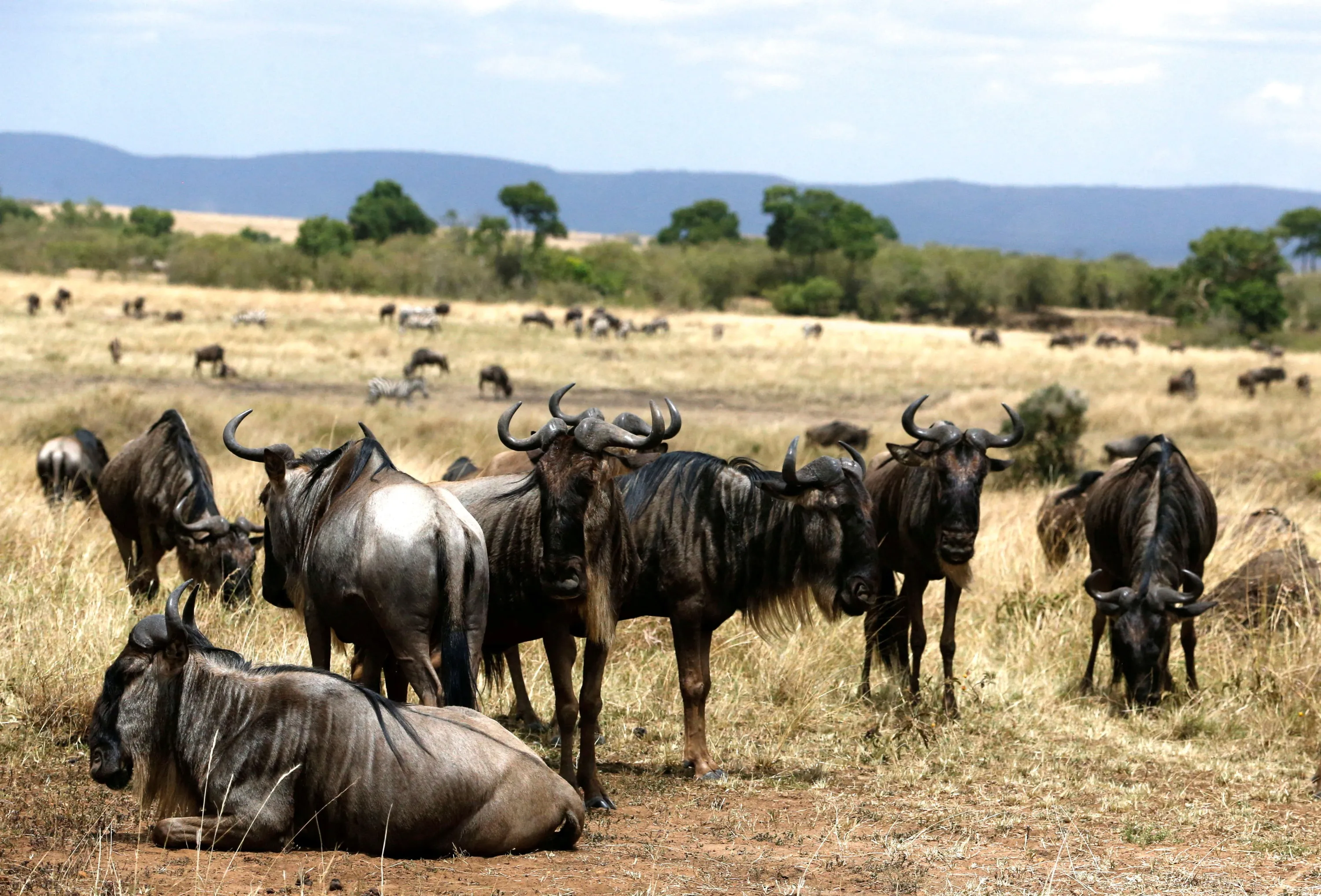 Wildebeests (Connochaetes taurinus) are seen during their migration to the greener pastures, between the Maasai Mara game reserve and the open plains of the Serengeti, southwest of Nairobi, in the Maasai Mara game reserve, in Narok County, Kenya on August 22, 2023. (Photo by Thomas Mukoya/Reuters)