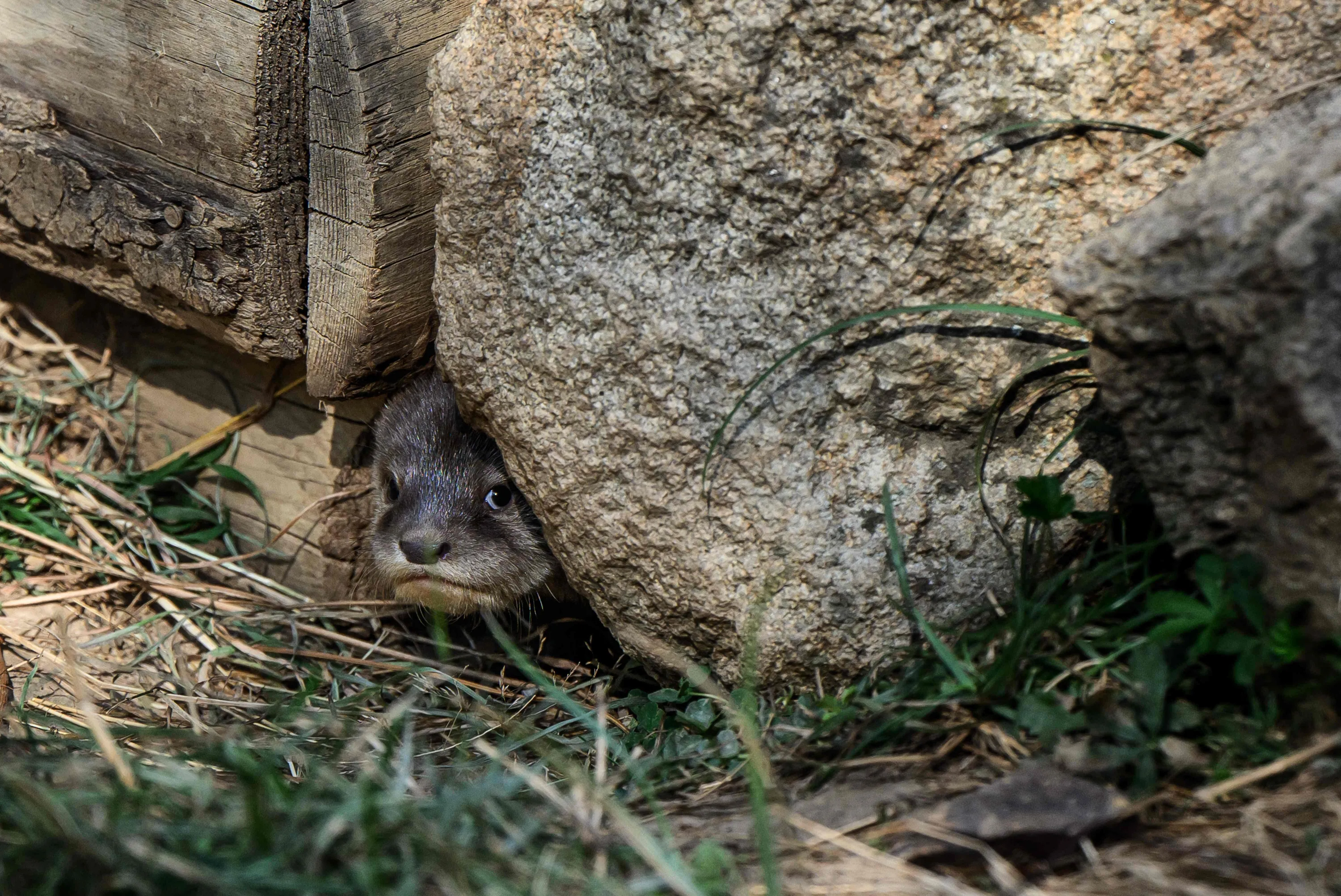 A 2 months old Asian dwarf otter looks on, at the Parc Animalier d'Auvergne in Ardes, on August 17, 2023. Three males and one female: a pair of dwarf Asian otters, a species in danger of extinction, gave birth to four otters, whose sex could be identified on August 17, 2023, at the Auvergne Wildlife Park in Ardes. (Photo by Jeff Pachoud/AFP Photo)