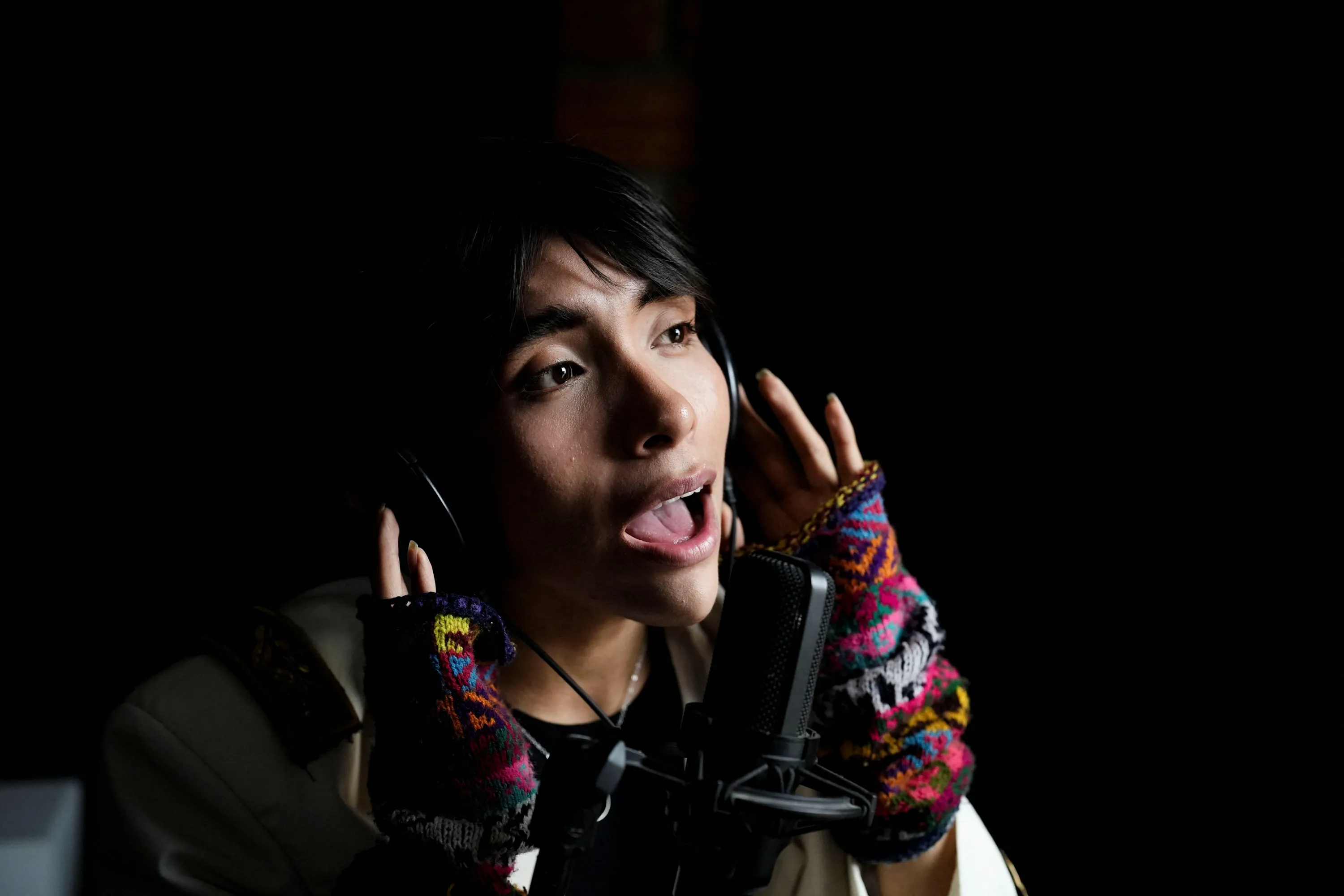 Peruvian singer Lenin Tamayo records a song as he takes on Peru's music scene with a new genre that resembles South Korean pop music but with songs in Quechua, the language of the Incas, in Lima, Peru on August 17, 2023. (Photo by Angela Ponce/Reuters)