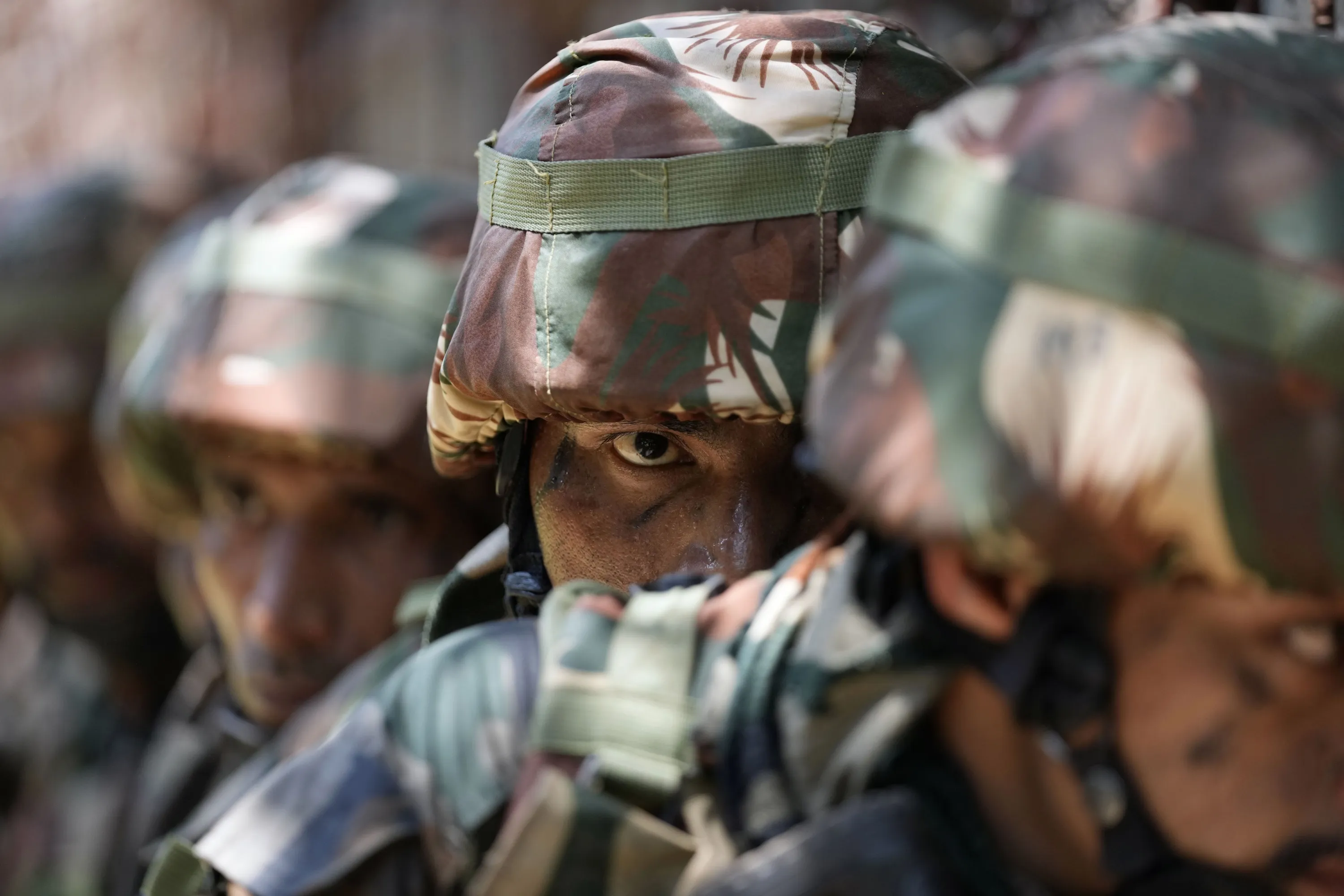 Indian army soldiers display an exercise along the Line of Control or LOC between India and Pakistan during a media tour arranged by the Indian army in Jammu and Kashmir's Poonch sector, India, Saturday, August 12, 2023. (Photo by Channi Anand/AP Photo)