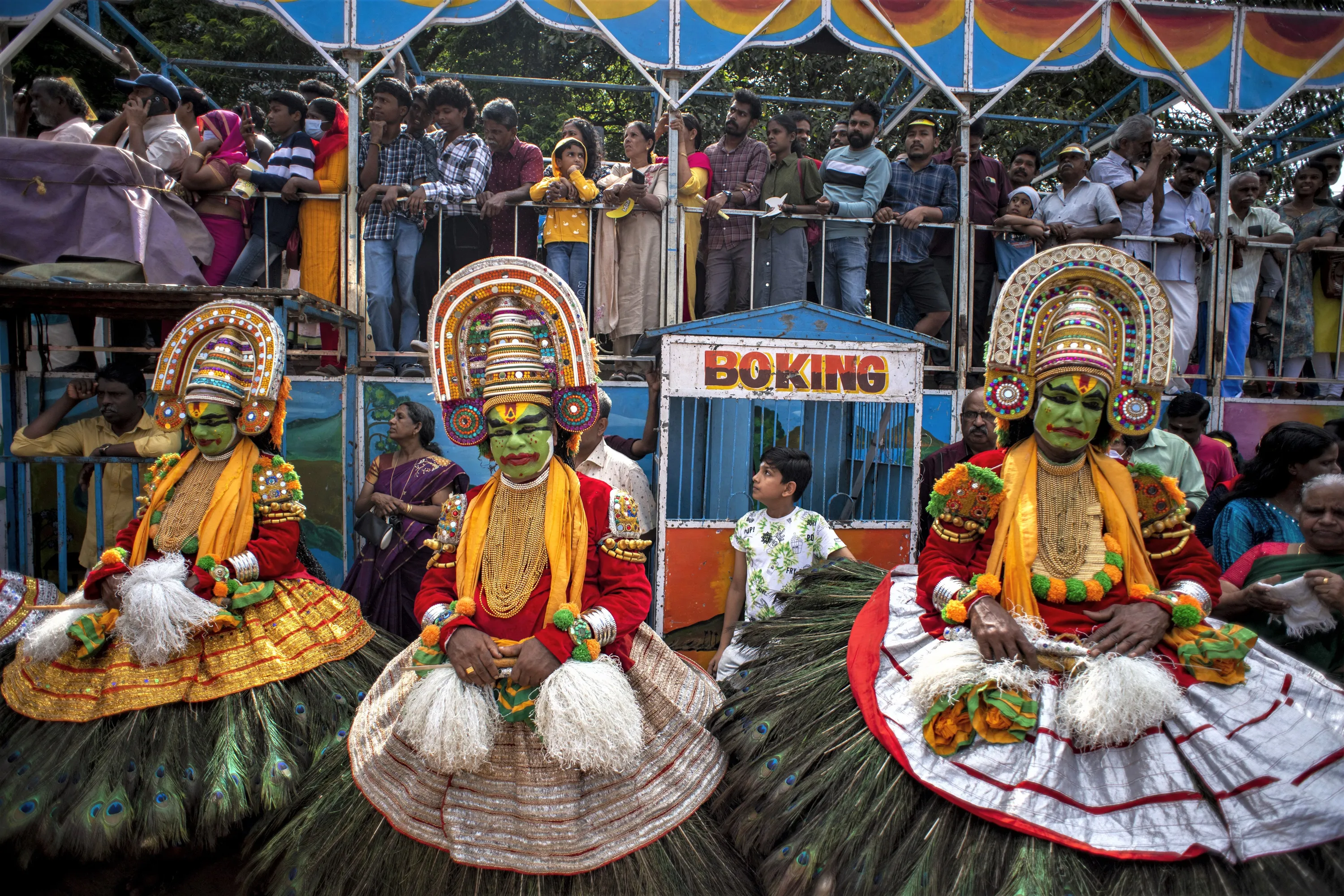 Artists wait to participate in a procession marking 'Atham', the first day of ten-days long Onam festival in Kochi, Kerala state, India, Sunday, August 20, 2023. (Photo by R.S. Iyer/AP Photo)
