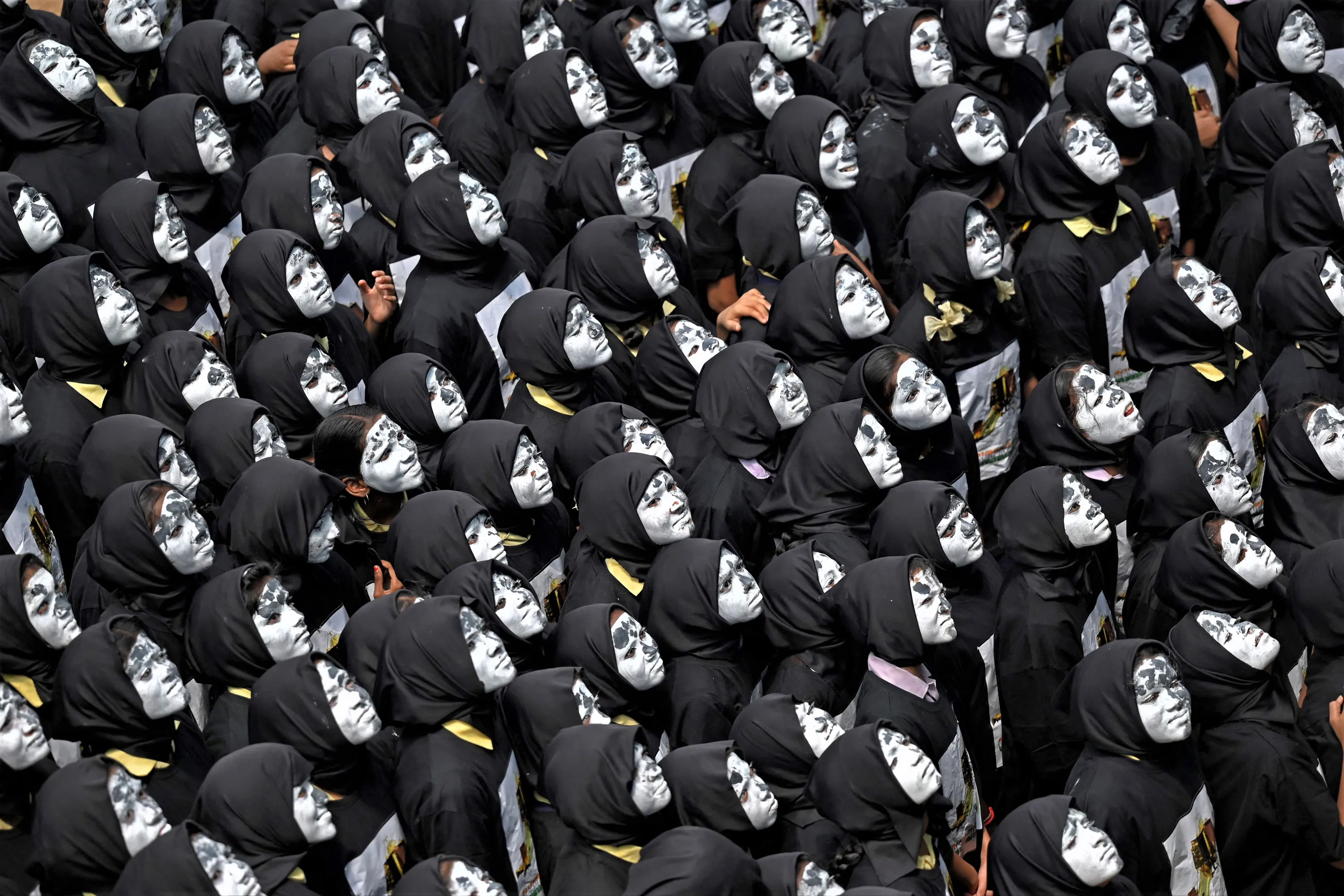 Students with painted faces gather in support of the Chandrayaan-3 spacecraft in Chennai on August 22, 2023. The Indian Space Research Organisation (ISRO) confirmed that the lander module of the Chandrayaan-3, which means "Mooncraft" in Sanskrit, had “successfully separated” from the propulsion module six days ahead of a planned landing slated for August 23. India launched a rocket on July 14 carrying an unmanned spacecraft to land on the Moon, its second attempt to do so as its cut-price space programme seeks to reach new heights. (Photo by R.Satish Babu/AFP Photo)