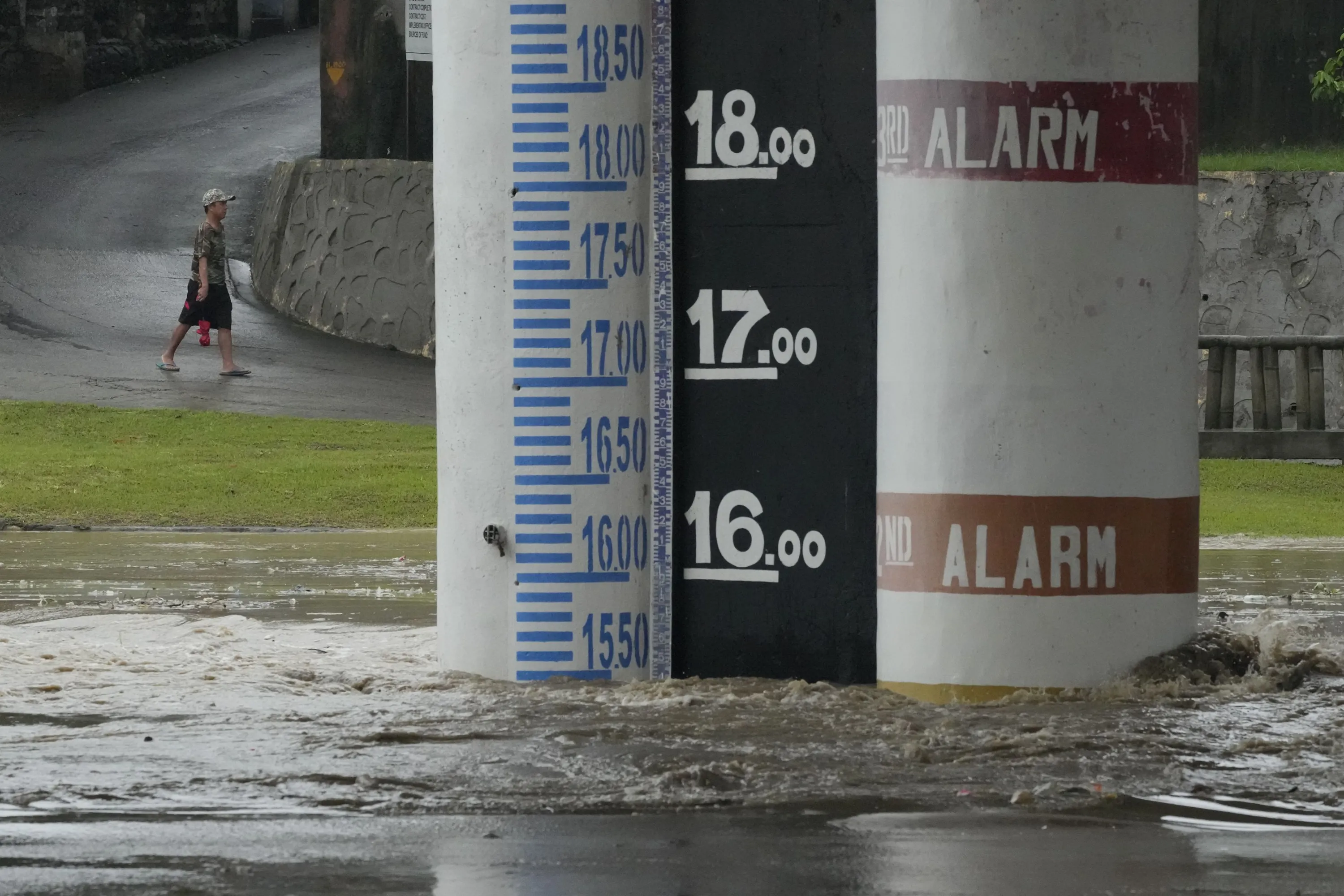 A man walks near a flood alert marker along a swollen river due to enhanced rains brought about by Typhoon Doksuri on Thursday, July 27, 2023, in Marikina city, Philippines. (Photo by Aaron Favila/AP Photo)