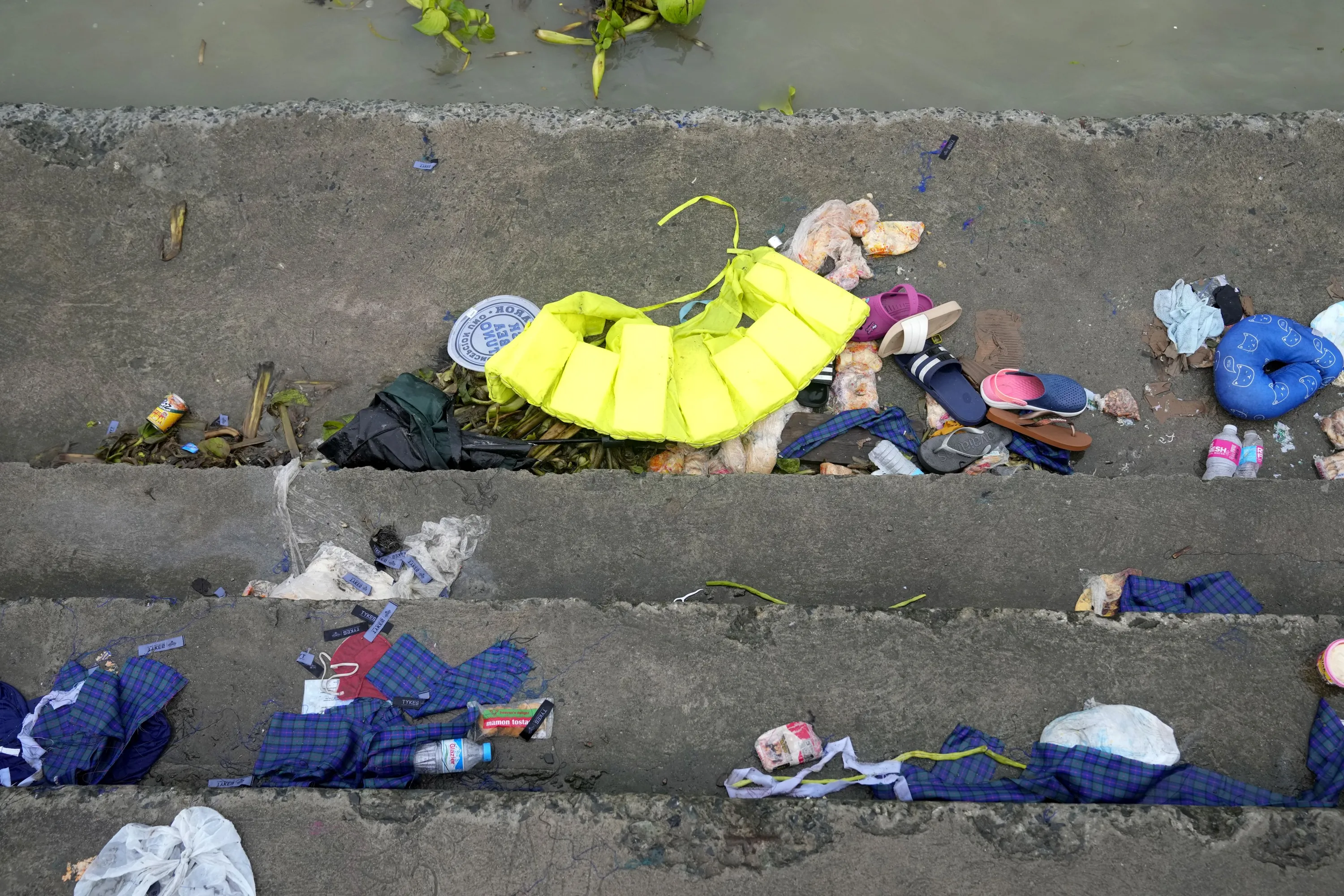 Items belonging to passengers of a capsized boat lie along the stairs of the Kalinawan port as search and rescue efforts continue in Binangonan, Rizal province, Philippines on Friday, July 28, 2023. (Photo by Aaron Favila/AP Photo)