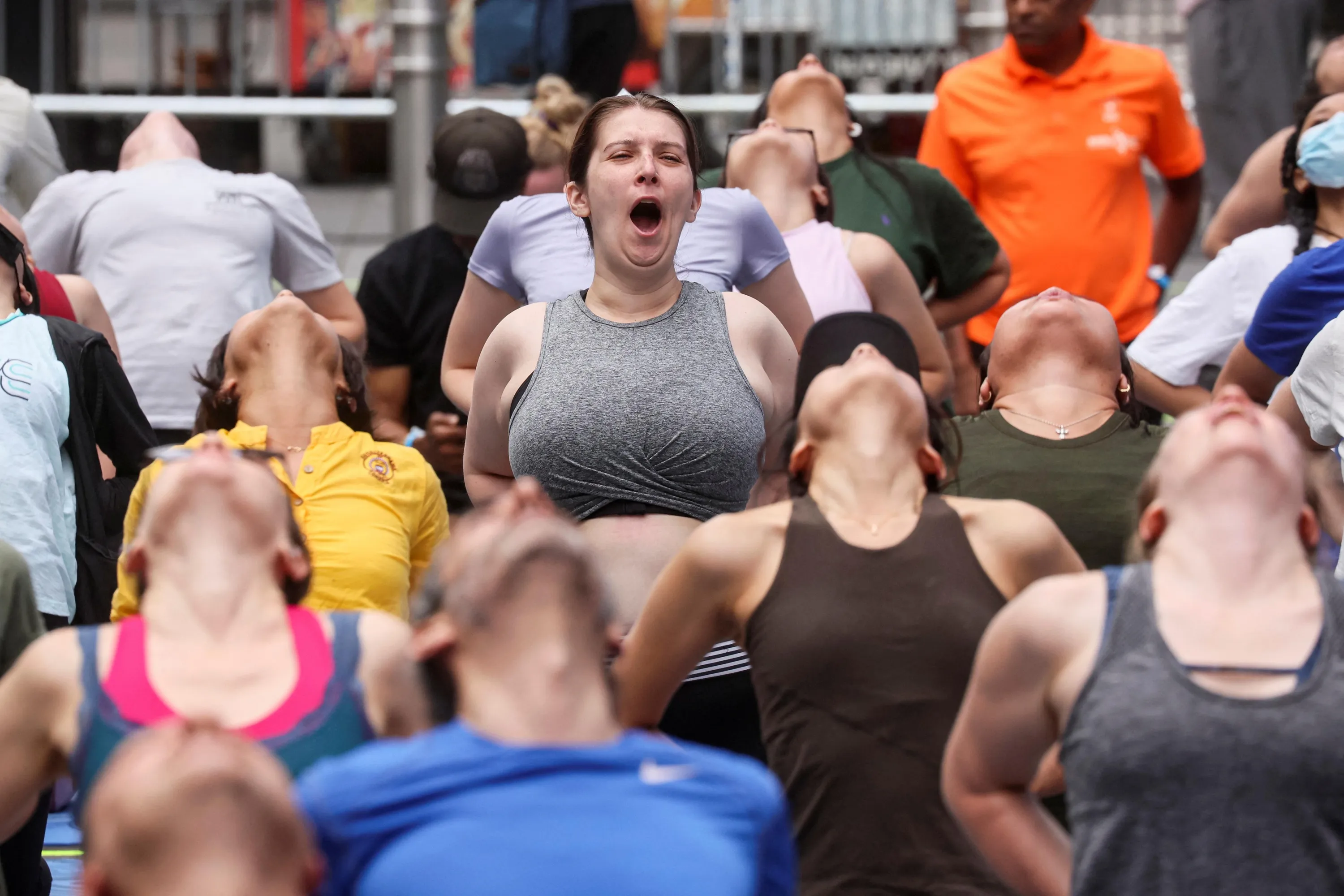 People participate in the “Solstice in Times Square: Mind Over Madness Yoga” to celebrate the summer solstice in New York City, U.S., June 21, 2022. (Photo by Brendan McDermid/Reuters)