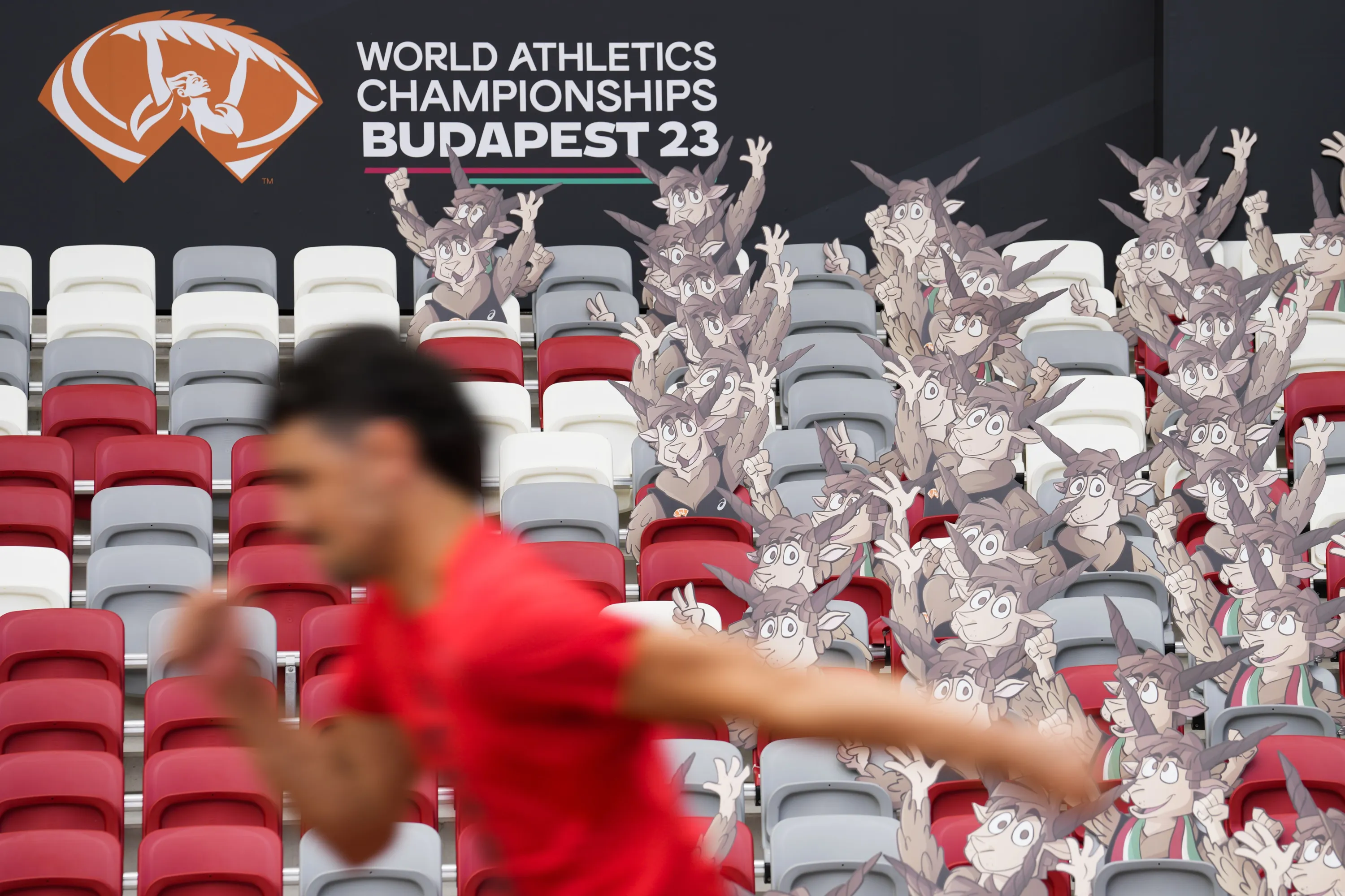 An athlete runs past cutouts of the games' mascot, Youhuu, a native Hungarian sheep, at the National Athletics Centre, one day ahead of the start of the World Athletics Championships in Budapest, Hungary, Friday, August 18, 2023. (Photo by Ashley Landis/AP Photo)