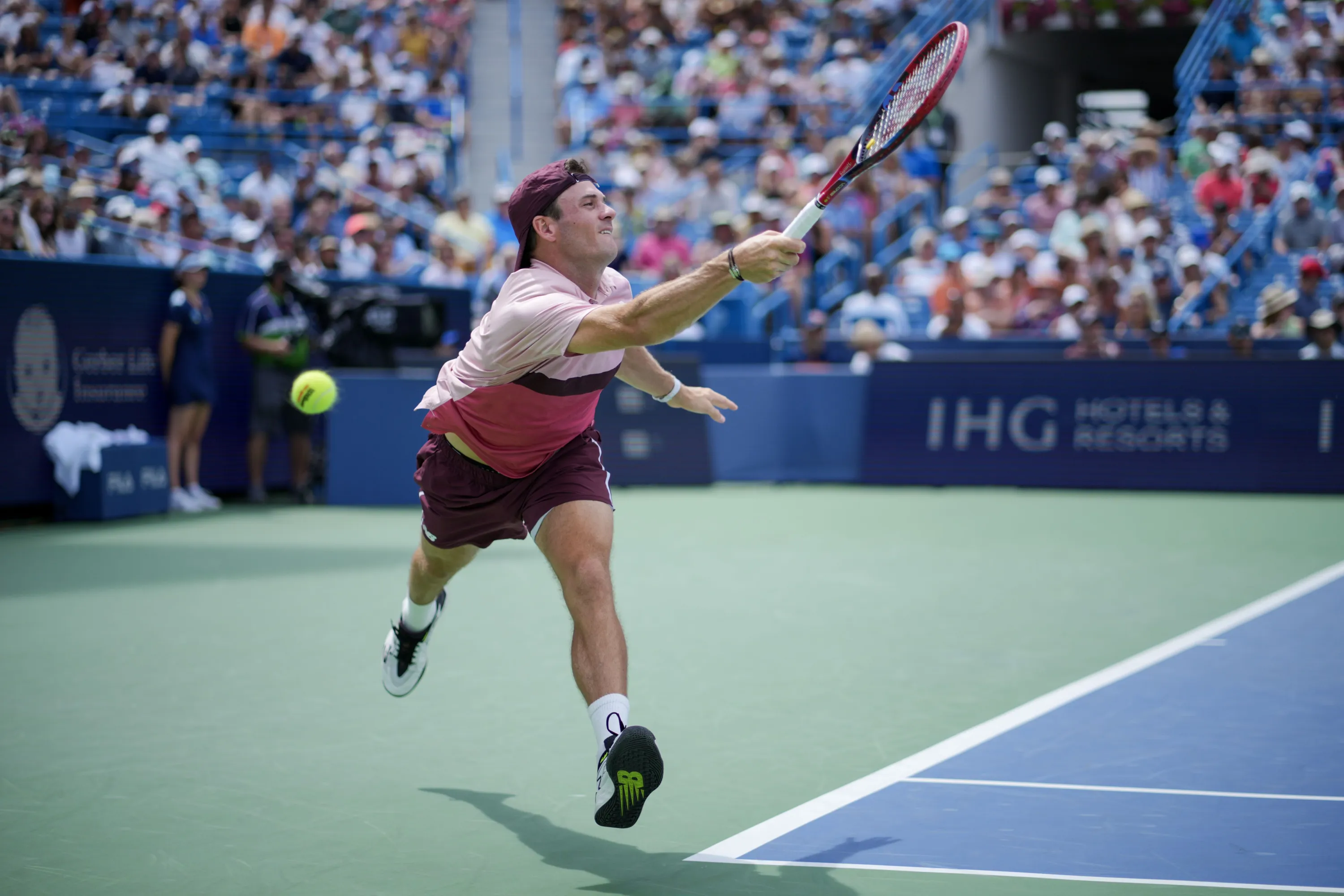 Tommy Paul of the United States is unable to return a shot to Carlos Alcaraz of Spain during their third round match on day 5 at the Western & Southern Open at Lindner Family Tennis Center on August 17, 2023 in Mason, Ohio. (Photo by Aaron Doster/Getty Images)