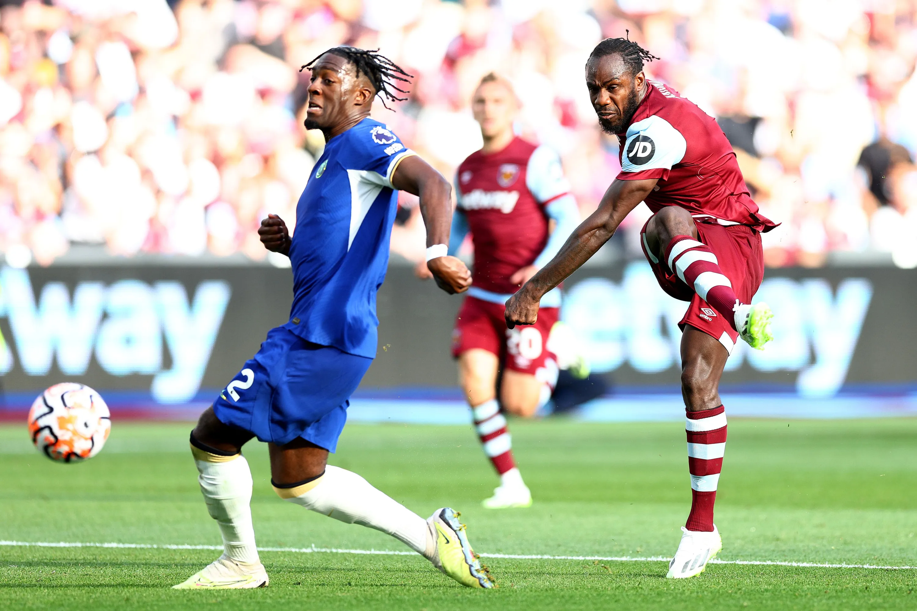 Michail Antonio of West Ham United scores the team's second goal during the Premier League match between West Ham United and Chelsea FC at London Stadium on August 20, 2023 in London, England. (Photo by Clive Rose/Getty Images)