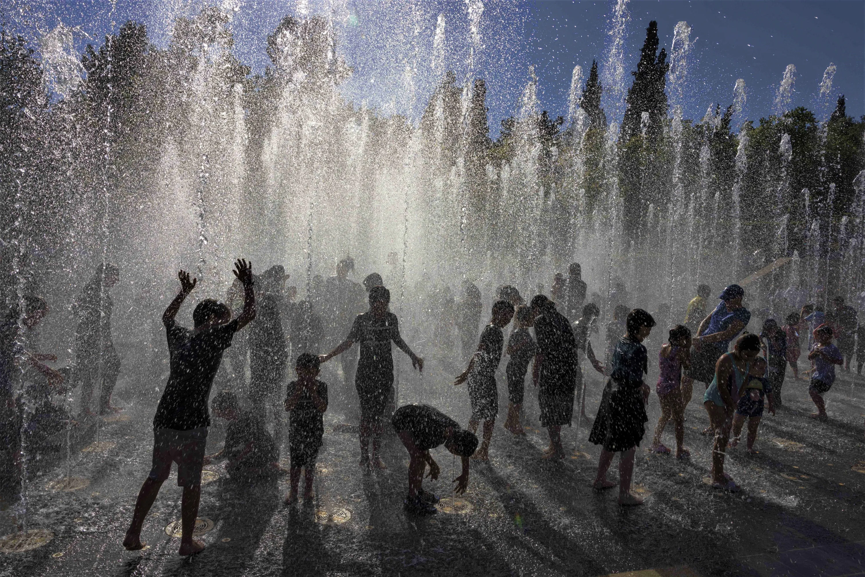 Ultra-Orthodox Jewish children along with other youngsters cool off during the summer heat, in a water fountain in Jerusalem on August 2, 2023. (Photo by Menahem Kahana/AFP Photo)