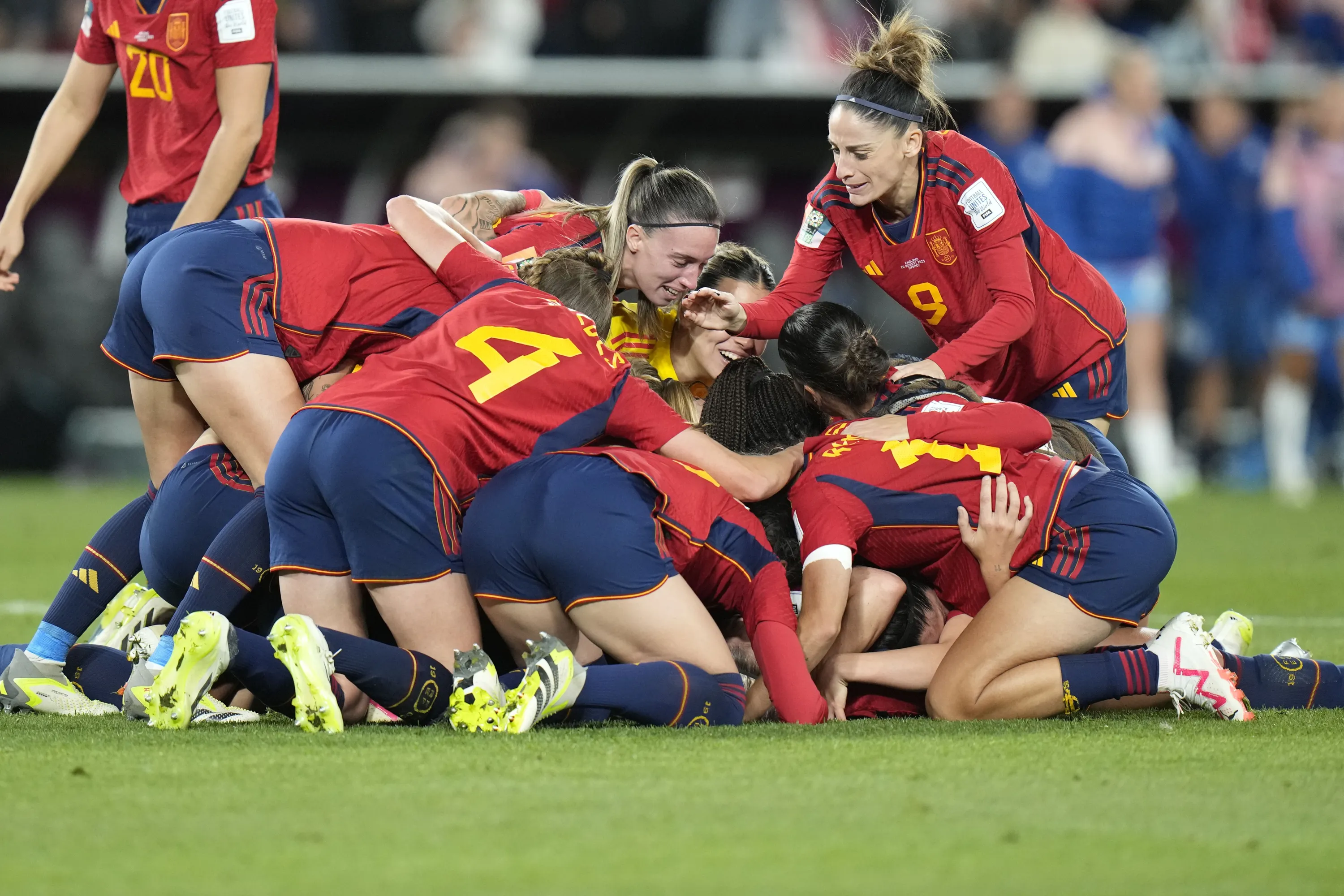 Spain teammates celebrate their victory over England in their final of Women's World Cup soccer between Spain and England at Stadium Australia in Sydney, Australia, Sunday, August 20, 2023. (Photo by Alessandra Tarantino/AP Photo)