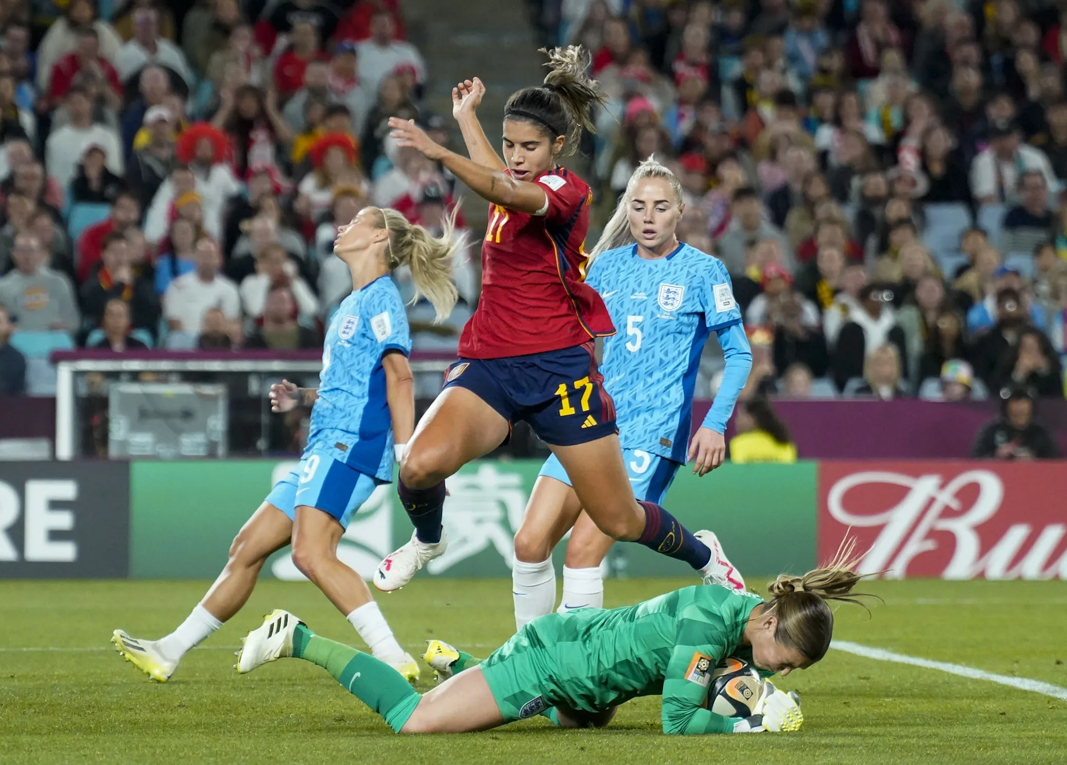 Spain forward Alba Redondo (17) leaps over England goalkeeper Mary Earps (1) as she dives on the ball for a save during the FIFA Women's World Cup 2023 Final match between Spain and England on Sunday, August 20, 2023, at Stadium Australia in Sydney, Australia, (Photo by Jabin Botsford/The Washington Post)