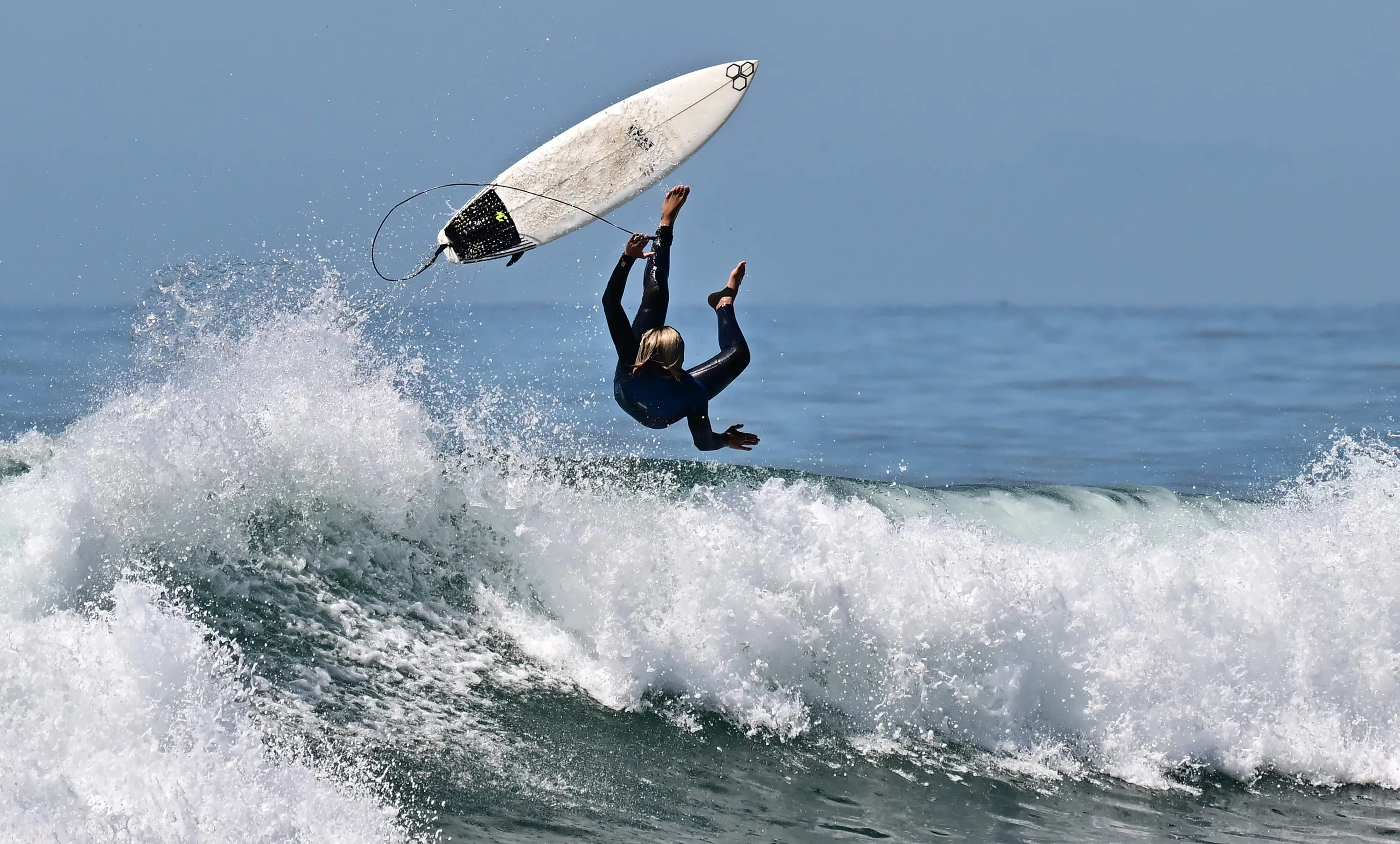 A surfer falls from their board a day after Tropical Storm Hilary swept through the area with large waves hitting south-facing beaches in Huntington Beach, California, on August 21, 2023. Tropical Storm Hilary drenched Southern California with record rainfall, shutting down schools, roads and businesses before edging in on Nevada on August 21, 2023. California Governor Gavin Newsom had declared a state of emergency over much of the typically dry area, where flash flood warnings remained in effect until this morning. (Photo by Frederic J. Brown/AFP Photo)
